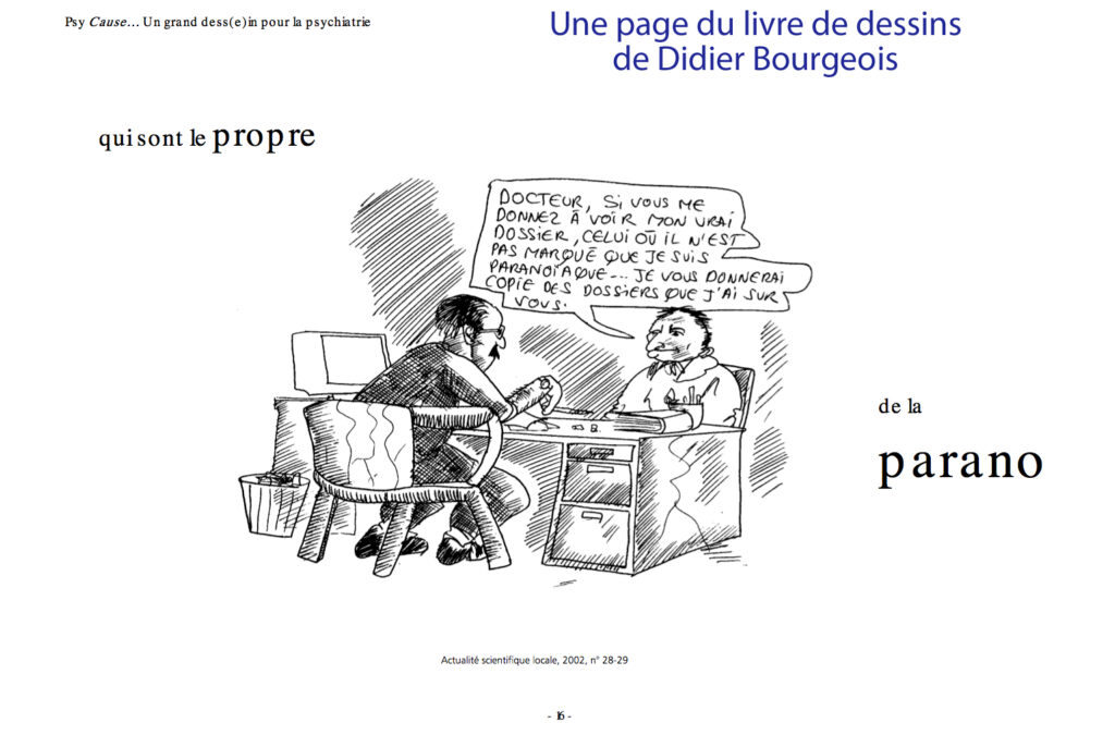 Didier Bourgeois est le secrétaire de rédaction fondateur de Psy Cause. Il a fait sienne en page d’accueil du site de la revue dont il est le webmaster, cette affirmation d’Alain Gavaudan, psychiatre chef de secteur à Marseille, lors de notre congrès de Martigues en 2003 : « Psy Cause n’est pas seulement une revue, c’est aussi un mouvement. » Dés le début de son implication dans la revue en 1995, Didier Bourgeois l’a considérée comme un engagement au service d’une cause. Ancien étudiant des Beaux Arts avant de faire médecine, il met son talent de dessinateur pour faire passer ses idées au travers de l’humour dans les pages de Psy Cause. En 2008, parait un recueil de ses meilleurs croquis (disponible à la vente).
