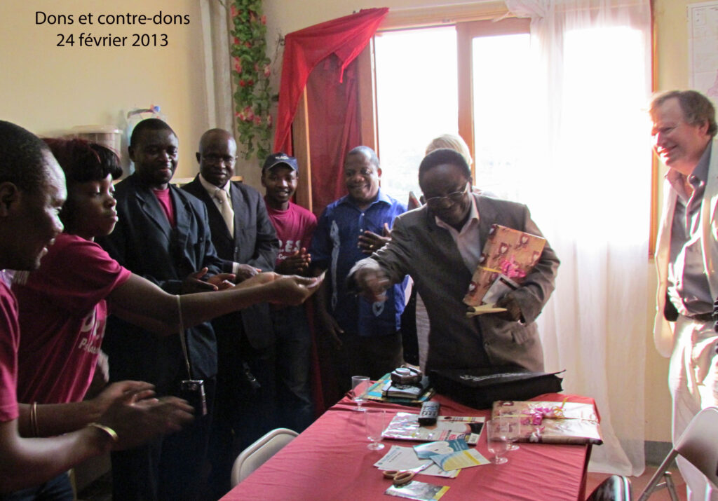 Le Dr Péguy Ndonko reprend la parole pour exposer aux invités les publications de la revue Psy Cause, passant en revue les plus récents numéros. Ensuite, tous les participants se rendent en cortège à la porte d’entrée des salles d’étude de Psy Cause Cameroun pour le geste symbolique de coupure du ruban suivi de l’ouverture de la bouteille de Champagne. Les locaux ainsi ouverts et baptisés, est procédé à la remise des dons et contre-dons. Après le « Benedicite » récité par la trésorière de Psy Cause Cameroun, nous partageons tous le repas convivial. C’est le temps privilégié du dialogue entre les membres de Psy Cause Cameroun et les invités.