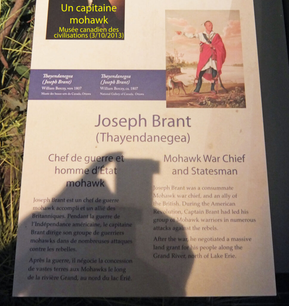 Une stèle du musée nous parle des Mohawks qui s’engageaient aux côtés des Anglais comme un certain nombre de colons loyalistes lors de la guerre d’indépendance des États Unis. Rappelons que la France apporta une aide décisive à cette révolte. Cette stèle raconte les services rendus de leur capitaine, Joseph Brant et la récompense : de vastes terres en Ontario. La défaite entraina une importante immigration loyaliste qui fonda Toronto. En 1812, les Américains attaquent le Canada et commencent par brûler Toronto. Cette fois ci toutes les communautés sont solidaires avec les Anglais y compris les francophones qui amorceront ainsi un long processus de reconquête de leurs droits. Les Anglais ont senti le vent du boulet. Mais ils ne cèderont pas sur l’autonomie des Canadiens sans la répression d’un mouvement révolutionnaire qui, une fois de plus, une vingtaine d’années plus tard, associa anglophones et francophones. Les francophones, nous a raconté notre guide, Mr Donald, avaient réussi à contrer numériquement l’immigration anglophone grâce à une discipline nataliste très stricte conduite par leur clergé catholique. Cependant, les francophones allaient peu à l’école et ce fut l’un des aspects majeurs de la « révolution tranquille » au Québec que de promouvoir massivement l’accès à l’éducation et de créer ainsi les élites d’aujourd’hui.