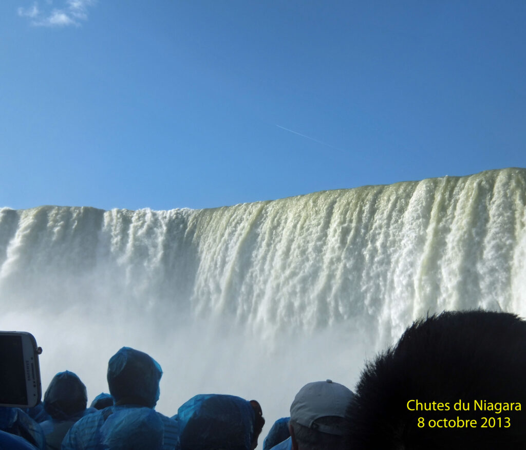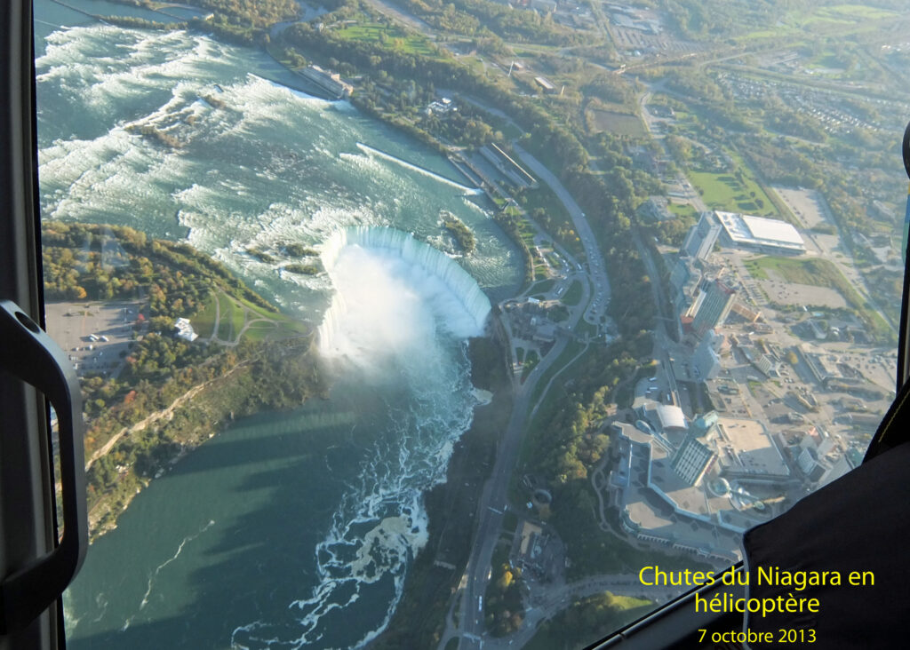 Depuis le Château de Montebello dans la forêt québécoise jusqu’aux chutes du Niagara, nous avons toute une journée tracé la route, environ 600 Km, instruits par notre guide, Mr Donald. Et nous n’avons pas vu le temps passer. Aux environs de Toronto, la pluie cesse (nous en aurons en totalité une journée sur tout le séjour du groupe, pas de quoi se plaindre) et nous retrouvons le soleil. Nous atteignons le Canada méridional, à la latitude de Bordeaux. Notre hélicoptère nous attend à Niagara Falls pour un inoubliable survol des chutes. Ces chutes sont un endroit mythique incontournable. À la frontière de l’État de New York. Derrière, on accède aux grands lacs d’où des explorateurs venus de Nouvelle France rejoignirent le Mississipi et conduisirent à la fondation, à la fin du XVII° siècle, de la Louisiane. Les plus belles des chutes du Niagara sont situées en territoire canadien et forment un arc de cercle. La visite en bateau est prévue pour le lendemain.