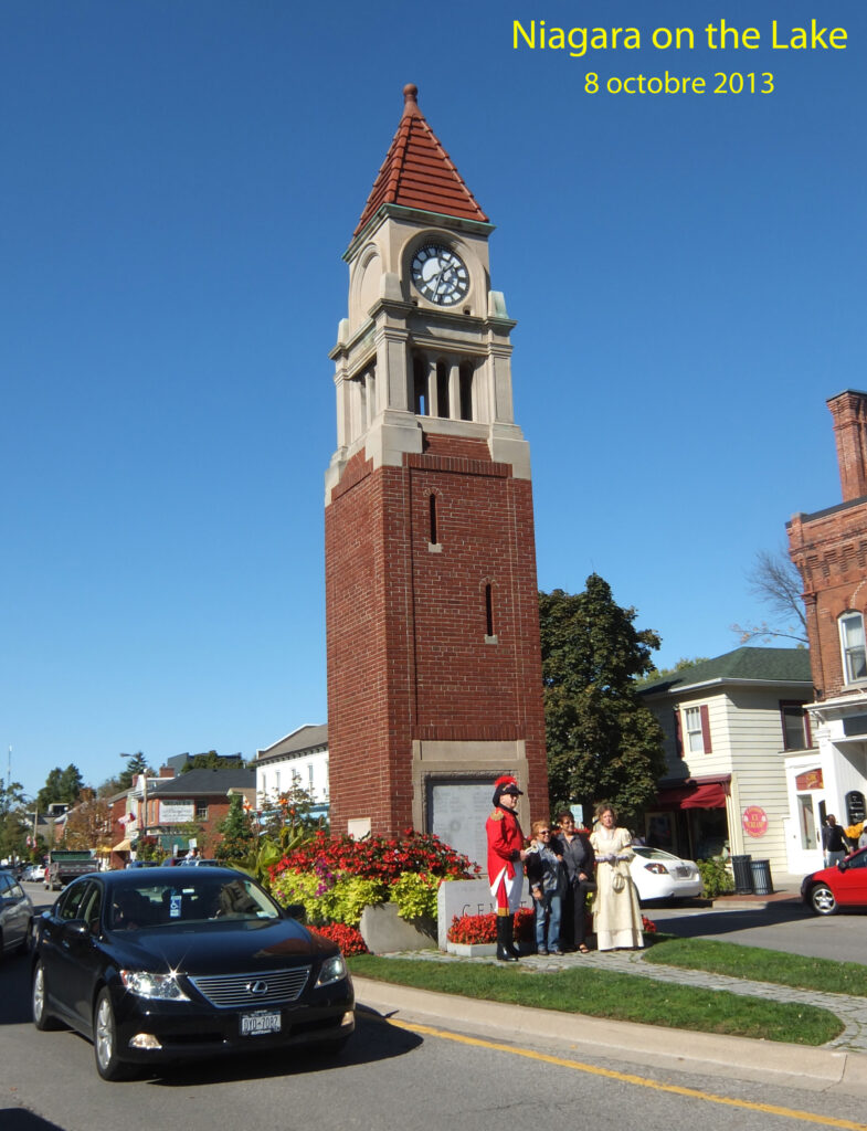 Après un déjeuner dans un restaurant panoramique, nous visitons « Niagara on the Lake », une charmante petite ville à l’architecture traditionnelle au bord du lac Ontario, en aval des chutes. L’architecture de cette région est typiquement britannique voire des États Unis proches. Notre guide, Mr Donald, constate que cette région est tout à fait charmante, avec un climat beaucoup plus avenant que dans le reste du Canada, mais que malheureusement, elle est habitée par des anglophones. Provocation mise à part, c’est un fait que Niagara on the Lake, est très britannique avec son cénotaphe en milieu de rue, tour miniature dont on trouve de nombreux exemples dans divers pays de l’ex Empire Britannique. Au long de le Rivière Niagara qui coule entre le lac Érié et le lac Ontario, se dressent des fortifications et une haute colonne au sommet de laquelle le général Issac Brock indique la direction de l’ennemi américain repoussé de ce coin d’Angleterre lors de la guerre de 1812, en un lieu où il mourut au combat.