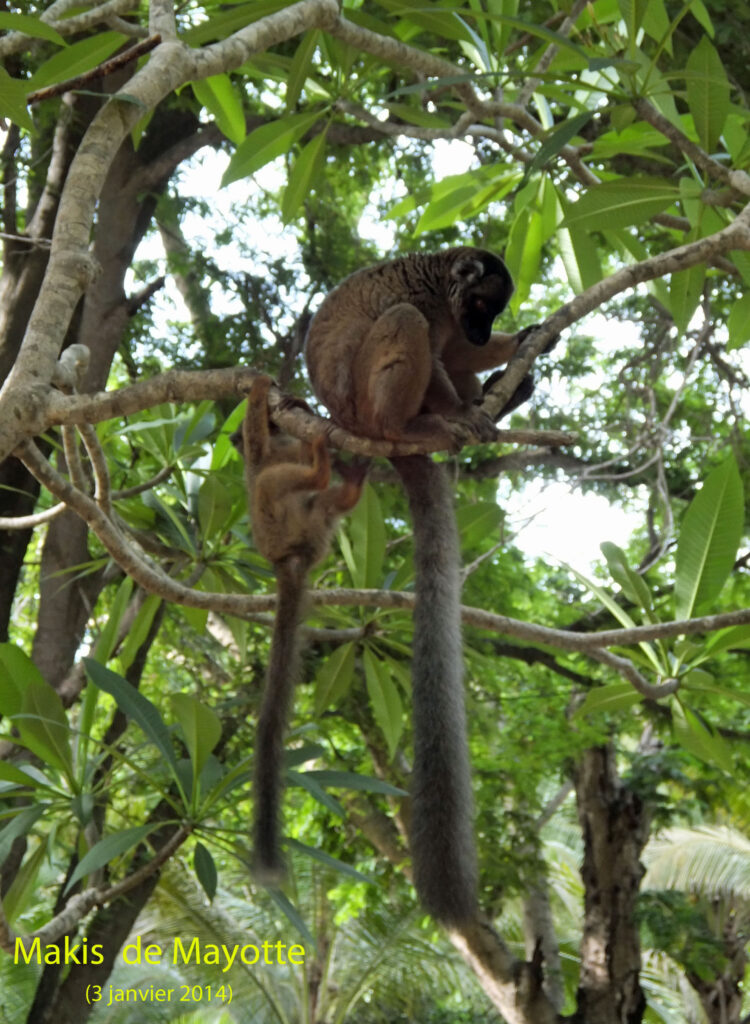 Nous pouvons poursuivre la descente de la côte Ouest jusqu’à la pointe Sud et la plage Ngouja, réputée pour ses tortues que l’on peut accompagner dans l’eau avec un masque et un tuba à marée montante. Cette plage de sable fin est bordée de toutes les espèces végétales de Mayotte : palmiers, baobabs et quelques petits coins de mangrove. Elle est aussi le paradis d’une espèce de primates très présente sur l’île (trop au goût des agriculteurs car ils s’attaquent aux récoltes) à savoir une race de Lémuriens appelés Makis de Mayotte. Ces animaux viennent aussi nous rendre visite tous les soirs devant notre bungalow à notre hôtel. Avec leurs yeux vifs, leur museau allongé et leur immense queue, leur agilité à sauter de branche en branche, ils ont quelque chose à la fois du singe avec leurs mains et de l’écureuil. Leur compagnie est un spectacle sans cesse renouvelé.