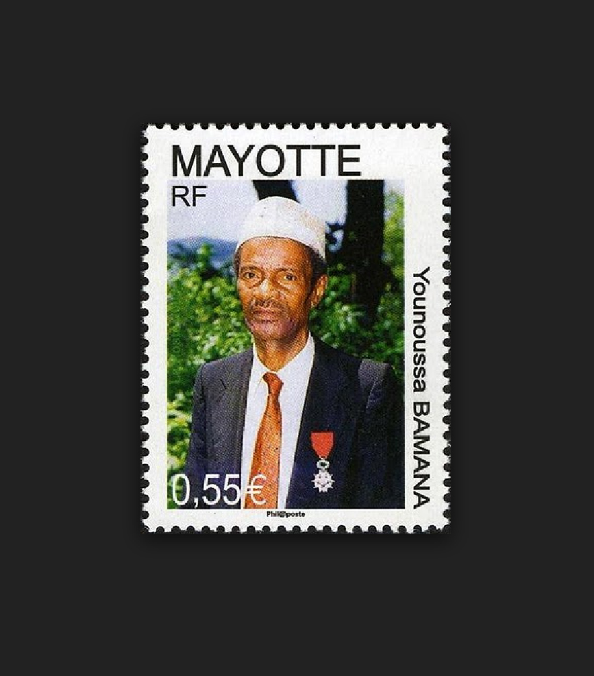 Ce troisième et dernier carnet évoque un autre personnage de l’histoire récente de Mayotte : le « Préfet » Younoussa Bamana. Sa mémoire a également été honorée suite à son décès en 2007 par un timbre des postes de la Collectivité départementale mahoraise (les émissions ont cessé en 2012 avec la mise en œuvre du nouveau statut de département). Nous allons évoquer son action à partir du livre de l’historien Jean Martin « Histoire de Mayotte, Département français » (Édition Les Indes savantes, 2010). La figure de proue du mouvement départementaliste de Mayotte fut Younoussa Bamana. « Ce fils de paysan de Kani-Bé, né le 1° avril 1935, avait été confié, à l’âge de 8 ans, à sa grand mère qui vivait à Pamandzi, puis quelques années plus tard, il avait eu la bonne fortune d’être pris en charge par une de ses tantes qui s’était établie à Madagascar. Écolier brillant, il fut admis au lycée Galliéni puis à l’École normale et revint dans son île pour être affecté comme instituteur au village de Sada. » Dans une île où les élites occidentalisées étaient fort peu représentées, il fut rapidement repéré par les leaders du mouvement mahorais dont il devint, « à bien des égards, la conscience ».