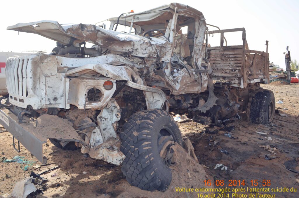 Le détachement constitué d’une section renforcée du bataillon Burkinabé de la Mission Multidimensionnelle de Stabilisation du Mali (MINUSMA) assurant la sécurité de la ville de Ber dans la région de Tombouctou, a été victime le 16 août 2014 à 11h 25mn, d’un attentat suicide sur leur campement. Il s’agit d’une voiture pickup bourrée d’explosifs qui est partie s’exploser sur le magasin d’armes. On a déploré deux morts et huit blessés graves.
