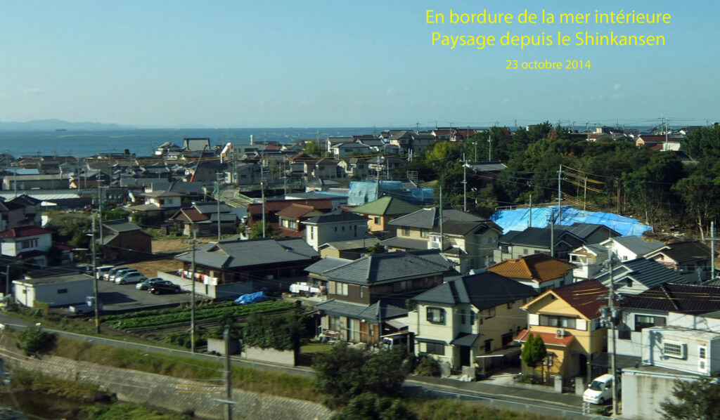 Le voyage en train nous permet de découvrir divers paysages du sud-ouest japonais, en particulier, de la mer intérieure du Japon. Bras de mer formé par l’espace entre plusieurs îles, que la voie ferrée à grande vitesse longe sur une grande partie du parcours.