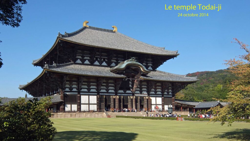 Il s’agit du temple Todai-ji qui renferme la plus grande statue de Bouddha en bronze du monde (quinze mètres de haut) dans la plus grande structure en bois du monde. Commandé en 743 par l’empereur Shomu, il fut achevé huit ans plus tard. De nombreuses destructions et reconstructions au fil des siècles ont ramené sa taille aux deux tiers de l’édifice original ! Quant à la statue de Bouddha à l’intérieur, selon la légende, elle fut coulée en bronze par plus de deux millions de Japonais, ruinant dans le même temps les réserves de métal de l’empire. Il témoigne à la fois de l’importance du bouddhisme aux tous débuts des temps historiques du Japon et de la puissance de l’état qui a commandité les travaux.