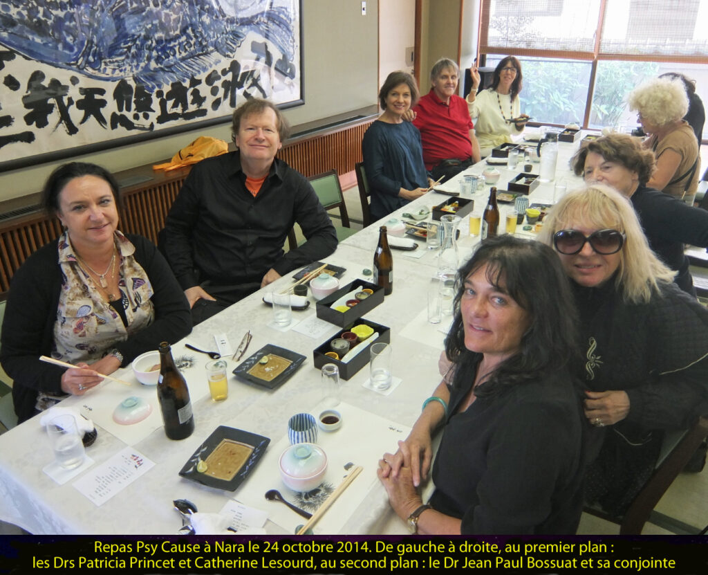 Nous terminerons ce dernier carnet du journal du congrès Psy Cause de Kyoto, par une évocation du dernier repas réunissant la totalité du groupe des congressistes français et canadiens, dans un restaurant traditionnel de Nara. Les deux organisatrices, le président et sa femme, sont rassemblés une dernière fois à la même table, avant de se séparer le lendemain, la Dr Patricia Princet continuant seule vers Tokyo avec les membres du groupe ayant choisi l’option Tokyo, tandis que la Dr Catherine Lesourd et le Dr jean Paul Bossuat avec sa conjointe, regagnent la France. Ce dernier repas est placé, comme la soirée anniversaire, sous le signe de l’harmonie et s’achève par un chant grec, chanté dans la langue hellène par une congressiste.
