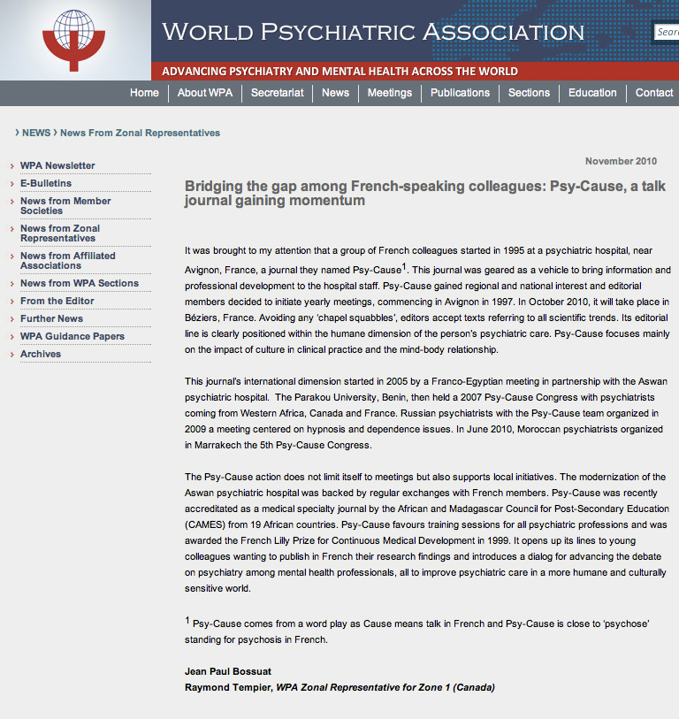 En 2010, le Pr Raymond Tempier est le représentant du Canada à la WPA (Association Mondiale de Psychiatrie) et publie en novembre de cette année là un article (en Anglais) sur Psy Cause dans WPA news. En novembre 2012, il découvre au congrès de Psy Cause à Siem Reap (Cambodge), l’œuvre du Pr Ka Sunbaunat qui a créé à partir de zéro et avec humanité, après le génocide des Khmers Rouges, un réseau de soins psychiatriques dans son pays. En fin d’année 2013, peu après le congrès Psy Cause à Ottawa dont il co-présidait le comité d’organisation, le Pr Raymond Tempier proposait la candidature du Pr Ka Sunbaunat, soutenue par Psy Cause, au prix de Genève pour les droits de l’homme en psychiatrie. Ce prix est solennellement remis au Pr Ka Sunbaunat au congrès de l’Association Mondiale de Psychiatrie à Madrid le 18 septembre 2014. Auparavant, notre Assemblée Générale du 26 août 2014 avait désigné le Pr Raymond Tempier à la fonction de représentant de Psy Cause International et de la revue Psy Cause (dont il est rédacteur et membre du comité de lecture) auprès de l’Association Mondiale de Psychiatrie.