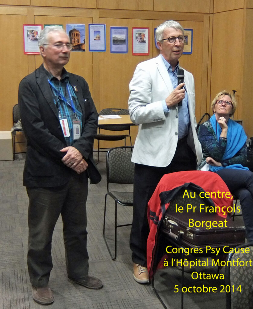 – Secrétaire de rédaction à l’Amérique du Nord : Pr François Borgeat. Président du conseil scientifique du congrès Psy Cause à Ottawa en octobre 2013, Professeur titulaire de psychiatrie à l’université de Montréal et membre du conseil d’administration de la Commission de santé mentale au Canada, il est psychiatre et chercheur à l’Institut Universitaire en Santé Mentale de Montréal (anciennement Hôpital LH Lafontaine). Il a obtenu un siège social dans cet institut au groupe Psy Cause Canada en cours de constitution. La venue à Montréal d’une délégation de Psy Cause International est prévue pour la seconde semaine de septembre 2015, afin de participer aux premiers pas de ce groupe actuellement en cours de positionnement au Québec et en Ontario.