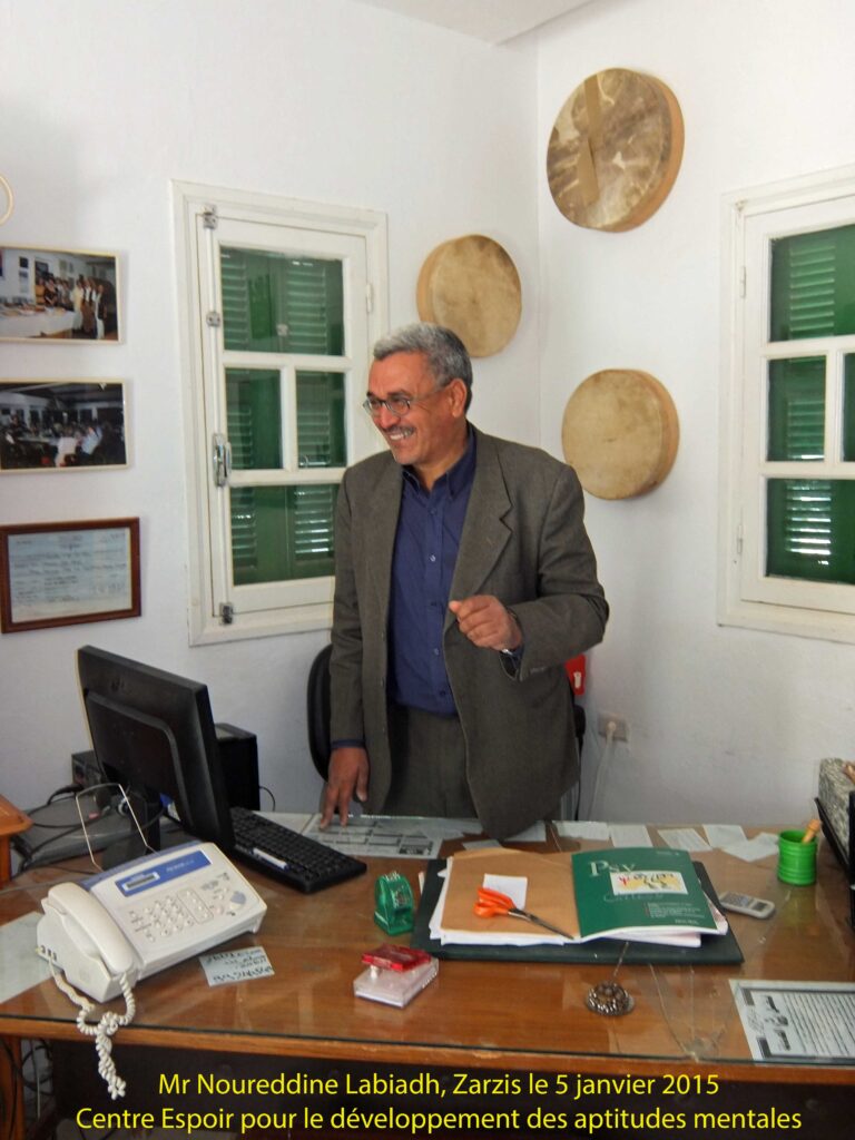 Ce centre est géré par la section de Zarzis de l’association UTAIM (Union Tunisienne d’Aide aux Insuffisants Mentaux). Mr Noureddine Labiadh se présente : il a fait carrière au sein de l’Education Nationale tunisienne dans l’enseignement technique et son dernier poste avant détachement était celui de principal dans un lycée. Il est à présent mis à disposition de l’association Union Tunisienne d’Aide aux Insuffisants Mentaux. Il nous confie également qu’il a une activité artistique de calligraphe.