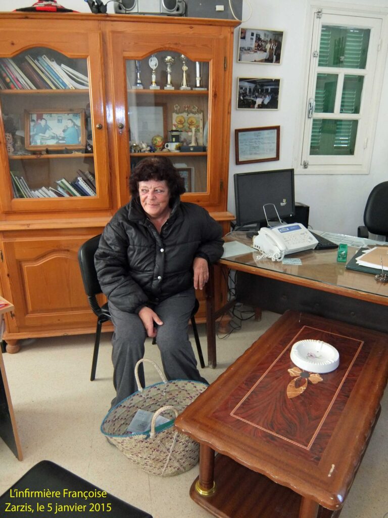 Mr Noureddine Labiadh nous présente Françoise, infirmière psychiatrique française domiciliée à Zarzis, qui apporte son savoir faire dans le centre. Elle a fait sa carrière en France et a longtemps exercé dans des structures extrahospitalières du Dr Bléandonu, à Chambéry.