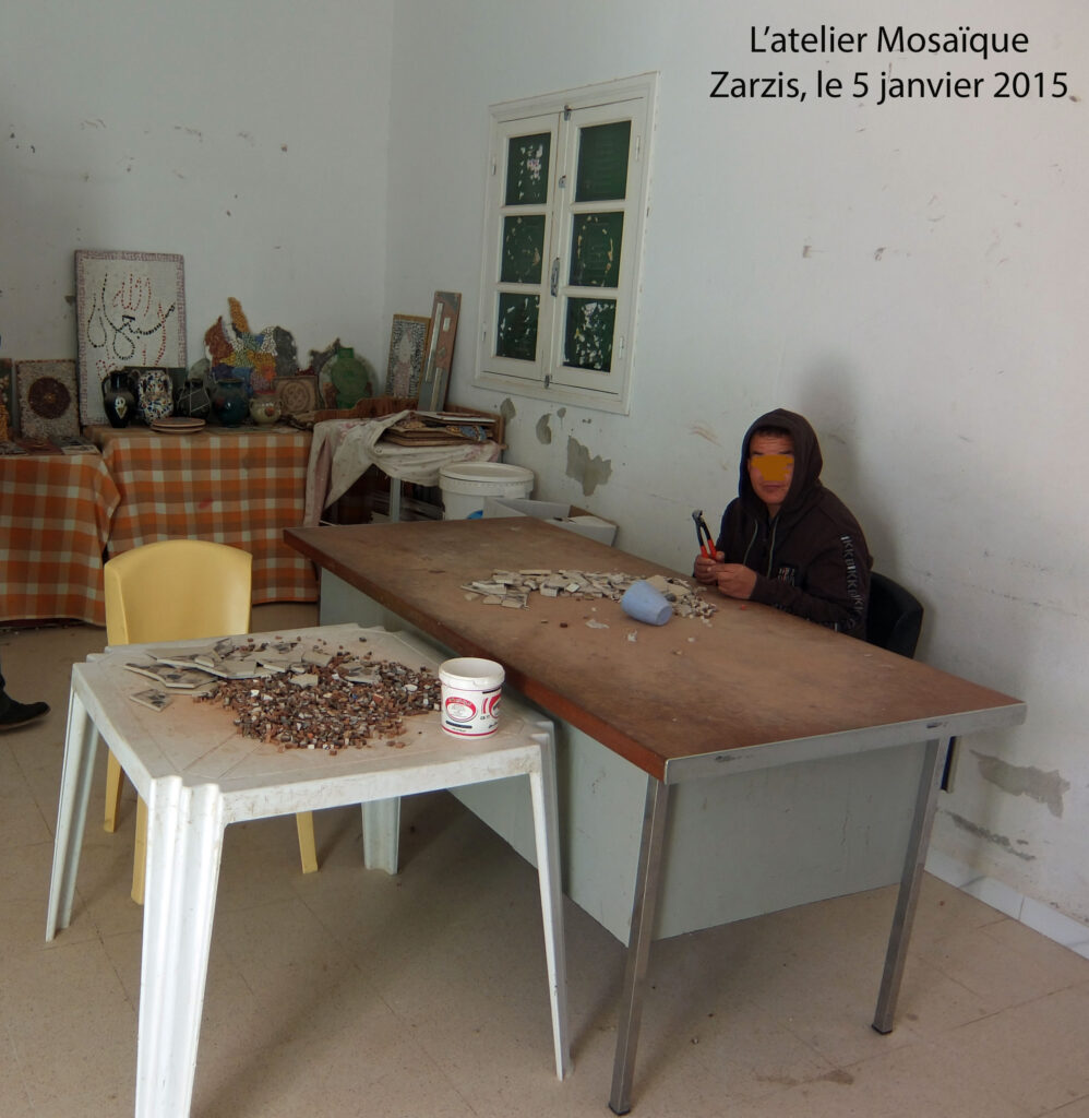 Mais l’atelier dans lequel nous nous attardons le plus, pratique la calligraphie avec de la mosaïque. Un handicapé armé d’une pince, découpe en petits carrés du carrelage. Mr Noureddine Labiadh détaille l’intérêt de ce travail : « nous avons été confrontés à une propension à détruire. Le fait de passer des journées entières à réduire en petits morceaux des carreaux calme cette pulsion. Ensuite, il y a le tri en fonction des couleurs pour mettre en forme les éléments constitutifs de la mosaïque. Puis la disposition pour donner forme à l’écriture. Cette activité est d’une grande richesse quant aux potentialités qu’elle développe. » Lors de la poursuite de la visite , le directeur fait observer l’entretien impeccable et la propreté des locaux auxquels sont associés les handicapés et autistes.