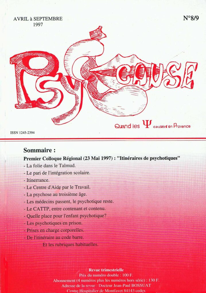 Dans ce numéro 8/9, le Dr Jean Paul Bossuat, directeur de la revue et médecin chef du secteur Chateaurenard-Saint Rémy de Provence, écrit en éditorial : « en juillet 1995, sortait le N°1 de Psy Cause : un modeste polycopié à vocation locale mais dont l’adhésion immédiate des lecteurs fut déterminante pour la suite (…). Il s’agissait pour nous de créer un support à une communication de proximité, entre des individus de plus en plus enfermés dans des isolats (pour reprendre un terme cher à Lucien Bonnafé), c’est à dire favoriser un dialogue entre institutions, secteurs, corporations professionnelles, modes d’exercice. » Le Dr Thierry Lavergne, rédacteur en chef de la revue et praticien hospitalier au Centre Hospitalier Montperrin, présente ainsi dans ce numéro le premier congrès de Psy Cause : « l’idée de ce colloque s’est construite (…) lors d’échanges autour des articles que nous recevions et d’après les témoignages de nos lecteurs (…). La psychiatrie est née à l’asile là où le corps social mettait ses fous pour les protéger et se protéger. La deuxième moitié du XXème siècle a été consacrée à les en faire sortir et à tenter de les faire accepter par le corps social. En même temps, par chance, par héritage de la psychanalyse, grâce à la découverte de psychotropes puissants, la frontière entre le normal et le pathologique devenait de plus en plus floue. Et à la fin du siècle, nous y sommes, « l’avenir n’est plus ce qu’il était » (Paul Valéry). Cette fin de siècle correspond à l’achèvement du mouvement de désaliénation, et à la généralisation de la politique de secteur. Un des bilans de cette épopée héroïque passe par l’itinéraire social du fou. Un autre bilan de cette épopée est le haut niveau de conceptualisation et sa banalisation. (…) Une vraie rencontre avec le fou, ça dérange, et ça motive à se former. (…) Faire du soin nécessite un savoir-faire, donc du faire et du savoir. (…) Tout soignant se frotte au savoir et aux théories multiples qui soutiennent la psychiatrie. Et plus ou moins consciemment, il en arrive à conceptualiser une théorie de la pratique (Lantéri-Laura). (…) En publiant les actes du premier colloque régional de Psy Cause, nous proposons à ces savoir-faire, de se faire savoir et de se sauvegarder. »