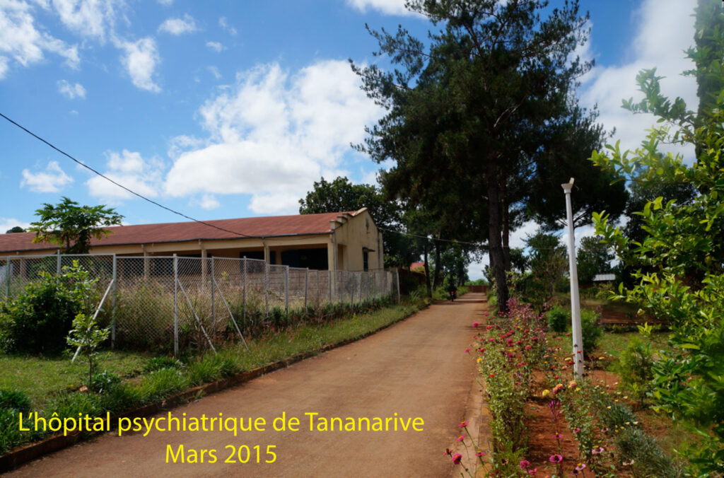 Nous avons débuté par la visite de l’hôpital psychiatrique de Tananarive, centre de référence en santé mentale de toute l’île. Il se compose de 4 pavillons de 20 lits, dont un plus confortable pour les malades payants, ainsi que de places de post cure. Nos échanges avec les équipes, les médecins spécialisés en santé mentale et les médecins psychiatres ont été très intéressants. Le Docteur Lanto, psychiatre médecin directeur, a évoqué le travail en lien des médecins généralistes et des guérisseurs dans certaines provinces malgaches, avec utilisation du sondage ou livre magique. Son souhait était de nous présenter cette pratique lors du congrès prévu à Manakara.