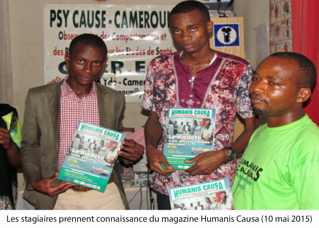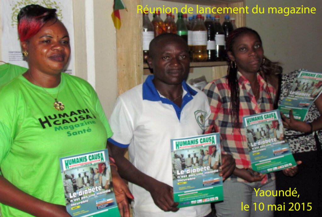 Le premier numéro du Magazine Humanis Causa porte sur le diabète, les causes, les complications et les traitements. Toute personne qui vient en consultation emporte un numéro. Nous ne prenons pas en charge seulement les diabétiques : les patients du VIH/SIDA entrent dans notre registre de compétence. Les patients qui sont en chômage sont immédiatement recrutés à Psy Cause Cameroun pour un meilleure suivi. « Quand la maladie donne le travail ! »
