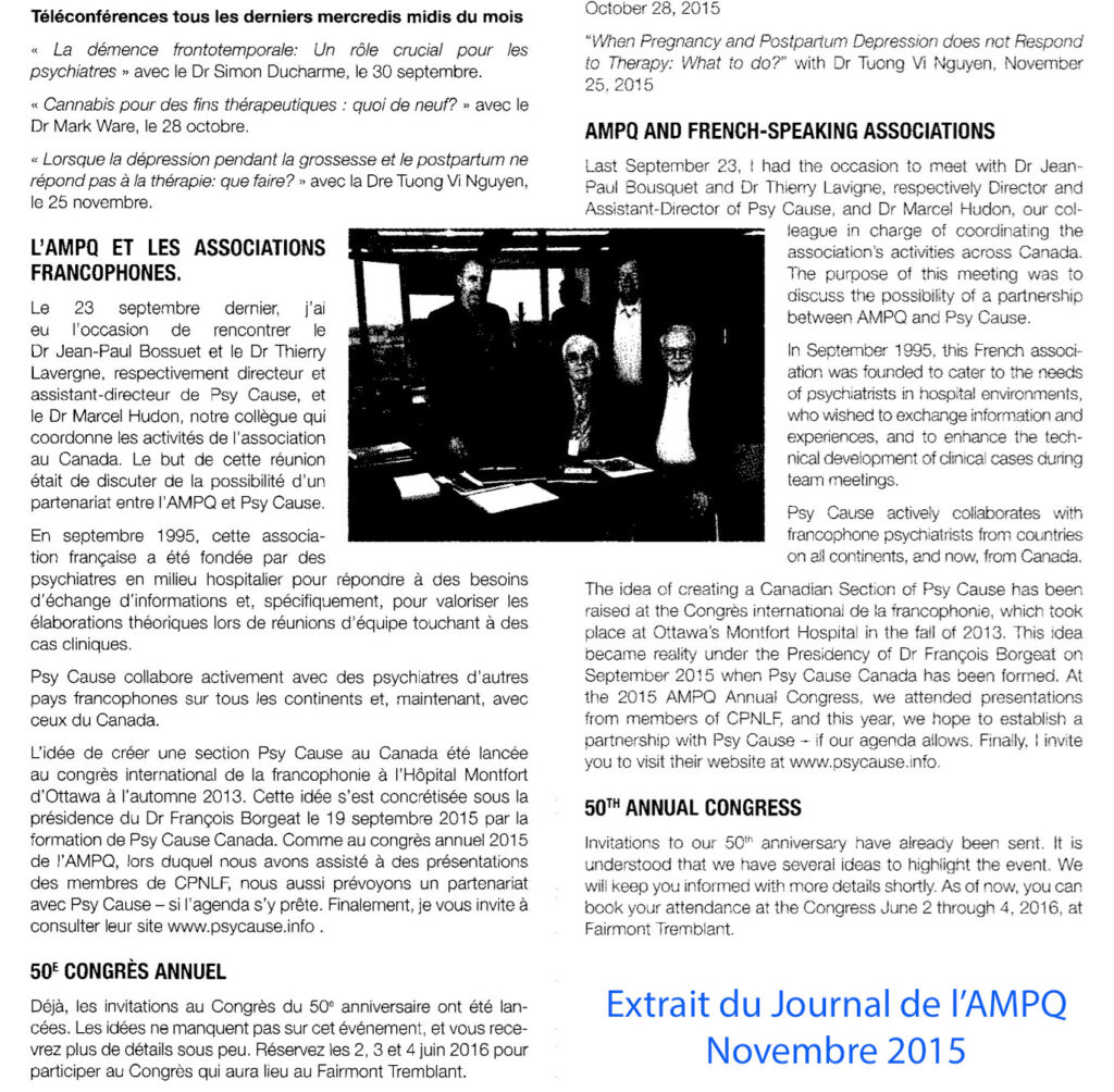 Les Drs Marcel Hudon et Suzanne Lamarre joignent dans leur courriel un scan de la page du Journal de l’AMPQ de novembre, qui évoque notre association internationale et la fondation de notre section canadienne à Montréal le 19 septembre 2015 (voir ci-contre). Le paragraphe a pour titre « L’AMPQ et les associations francophones. » Il précise que « Psy Cause collabore activement avec des psychiatres d’autres pays francophones sur tous les continents et, maintenant, avec ceux du Canada. » Il rappelle que lors du congrès annuel 2015 de l’AMPQ, les collègues du Québec ont « assisté à des présentations de membres de la CPNLF. »