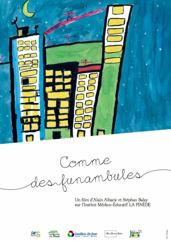 « « Comme des funambules », voilà comment les deux réalisateurs de ce magnifique documentaire sont ressortis de leur immersion d’une année au coeur du dispositif d’accueil et de la vie quotidienne à l’I.M.E la Pinède à Jacou. Derrière les représentations que chacun a du « handicap », existent des énigmes qui apparaissent dans ce film bouleversant, au travers des interrogations posées sur le soin, sur la différence, la créativité, et le vivre ensemble. La spécificité de ce lieu est de garantir par son approche éthique et pratique, les conditions pour que l’institution exerce sa fonction soignante, au sens où chaque enfant, chaque jeune a une place à prendre dans la société. Les outils proposés, au plus près de leurs besoins, viennent soutenir cette dynamique subjective. Nous observons que les choix faits par cette institution médico-sociale relèvent d’une orientation particulière associant la pédagogie et l’éducatif, pour accompagner des enfants, adolescents et jeunes adultes à être acteurs de leur vie en tant que sujets libres. Ce mode de résistance quant à la standardisation actuelle des types de prise en charge se révèle tout au long des témoignages des professionnels et des familles. La parole est le fil conducteur du récit, parole qui fait lien entre le singulier et le collectif, entre les soignants et les soignés. Aucun traitement psychothérapeutique ne peut se produire sans l’accueil de l’humain. »