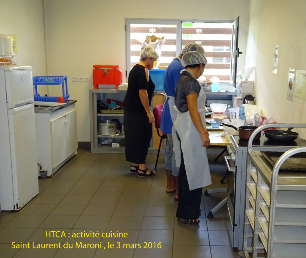 La durée de l’hospitalisation est brève avec des séjours qui excèdent rarement les quatorze jours et ne concernent que des hospitalisations libres. À leur sortie, les patients sont adressés au CMP, au médecin qui intervient sur le Haut Maroni et bénéficient d’un accompagnement paramédical. L’orientation peut s’effectuer également vers l’Hôpital de Jour. Nous visitons les locaux de l’HTCA, spacieux et aérés, dans lesquels se déroulent diverses activités au service de la dynamique soignante. Nous avons pu ainsi être présents lors d’une activité cuisine.