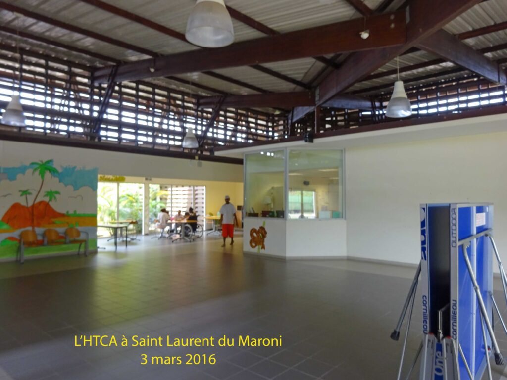 L’HTCA dispose de 17 lits et d’une chambre d’isolement. Deux psychiatres y interviennent ainsi qu’une équipe paramédicale de 10 infirmiers, 8 aides soignants, 1 AMP et 4 ASH. Le Dr Algossimo Diallo nous explique que nous sommes dans le secteur « Ouest Guyane », l’un des deux secteurs du département, l’autre étant le secteur « Est Guyane » basé dans le service de psychiatrie Cayenne/Kourou. Les admissions ont trois origines : le CMP, les urgences du Centre Hospitalier et les indications posées « sur le fleuve », c’est à dire sur le Haut Maroni. On retrouve toute la palette des diagnostics psychiatriques, principalement les psychoses chroniques, l’alcoolisme, les tentatives de suicide et dépressions, parfois des problématiques sociales liées à la précarité.
