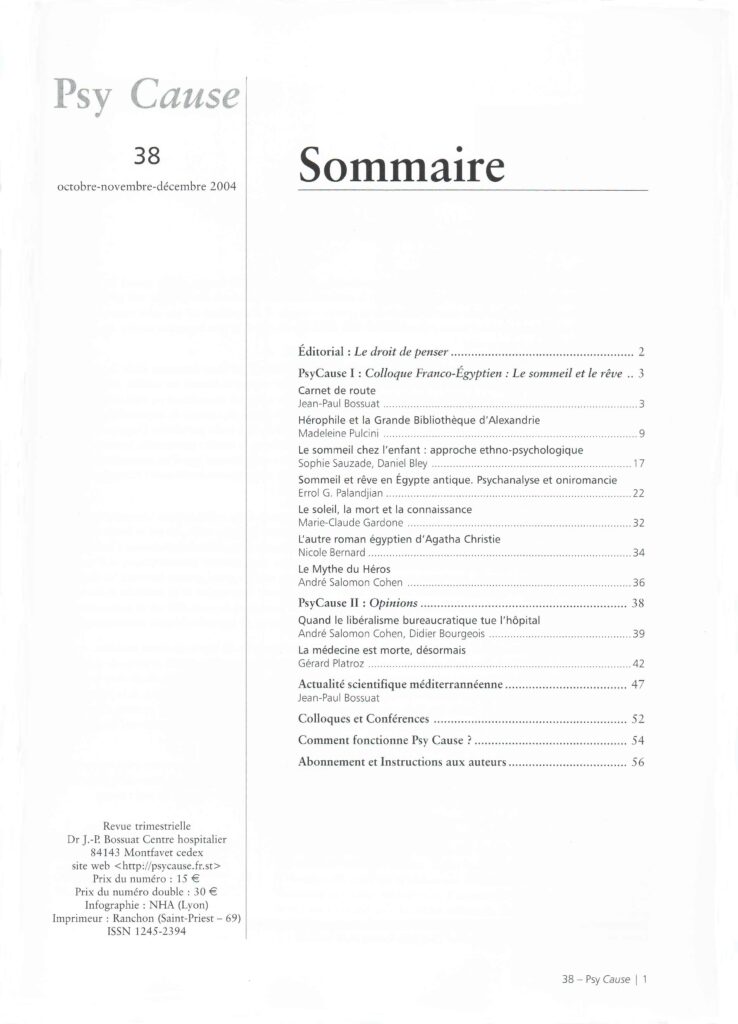 Le N°38 rend compte de notre premier colloque hors de France. Il s’agit du Colloque itinérant Franco-Egyptien « Le sommeil et le rêve » réalisé à l’automne 2003 et qui est notre première manifestation scientifique hors de France. L’un des temps forts de ce colloque fut de dépôt solennel de la collection complète de notre revue à la Grande Bibliothèque d’Alexandrie, le 25 octobre 2003. Depuis cette date, nous avons adressé dans cette prestigieuse institution toutes nos parutions. Ce colloque a initié quatre années de coopération continue avec des professionnels égyptiens, avec l’appui du Centre Hospitalier de Montfavet. Des échanges substantiels se sont mis en place jusqu’en 2007 avec l’Hôpital Psychiatrique d’Assouan.