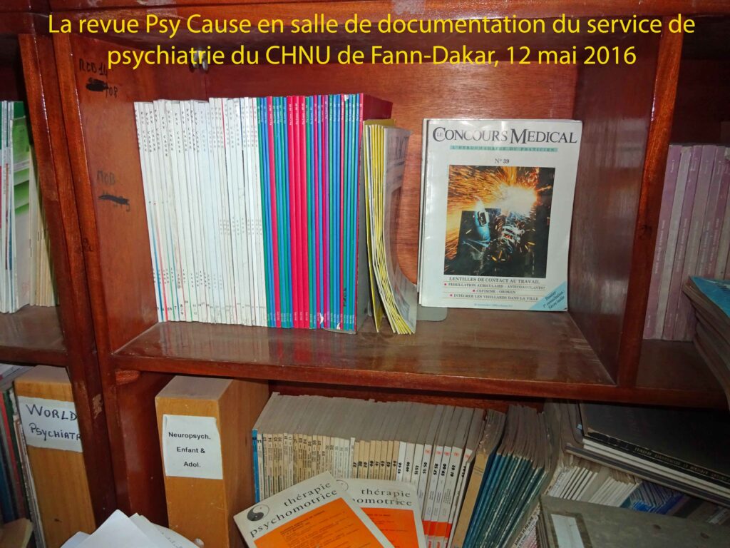 Après cette réunion fondatrice de Psy Cause Sénégal, le Dr Jean Paul Bossuat a été convié à une visite du service de psychiatrie. Il a ainsi retrouvé dans la salle de documentation la revue Psy Cause mise à la disposition des professionnels à partir du N°3 de janvier/mars 1996 ! Autant dire que les liens entre notre revue et le CHNU de Fann-Dakar ne datent pas d’hier…