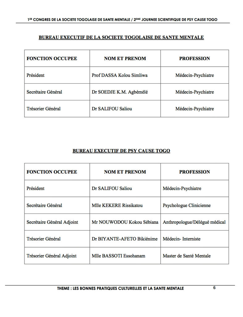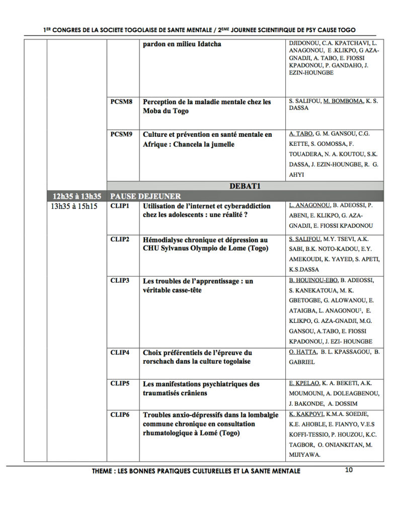 Les 15 et 16 septembre 2016 à Lomé, se déroulent le premier congrès de la Société Togolaise de Santé mentale et la seconde Journée scientifique de Psy Cause Togo, dans un espace appelé « Bluezone de Cacaveli ». Le livre des résumés des communications dont nous présentons quelques pages en illustration est introduit par quelques par des propos du Président de Psy Cause International, le Dr Jean Paul Bossuat, du Président de la Société Togolaise de Santé Mentale et Président du comité d’organisation, le Pr Kolou Valentin Dassa, et du Président de Psy Cause Togo, le Dr Saliou Salifou.