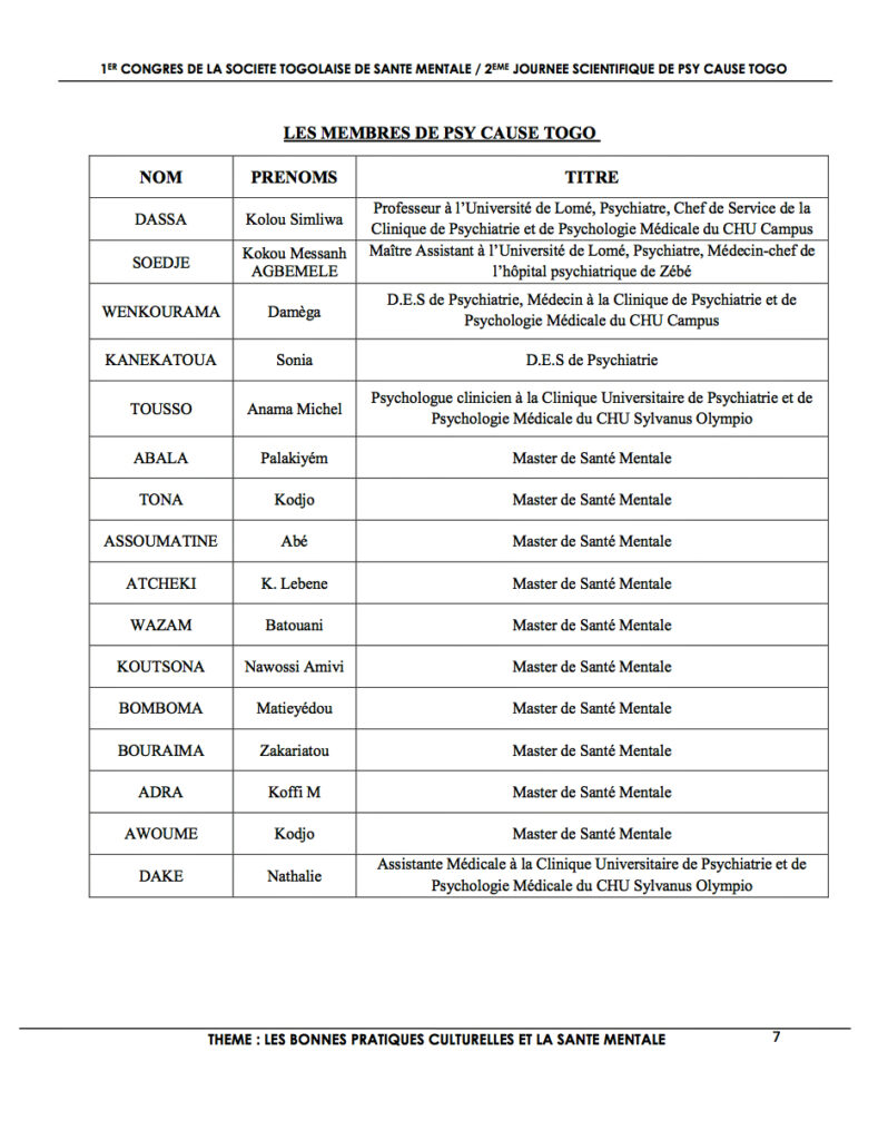 Le Président de Psy Cause Togo écrit : « Aucun développement n’est possible sans la prise en compte de la santé mentale. Mais force est de constater qu’au Togo, il existe très peu de professionnels de santé mentale. La finalité de l’éducation étant l’action et non le savoir, Psy Cause Togo, à travers la pérennisation des colloques, veut attirer les médecins généralistes, les étudiants en médecine, les infirmiers à s’intéresser davantage à ce domaine plein d’avenir.