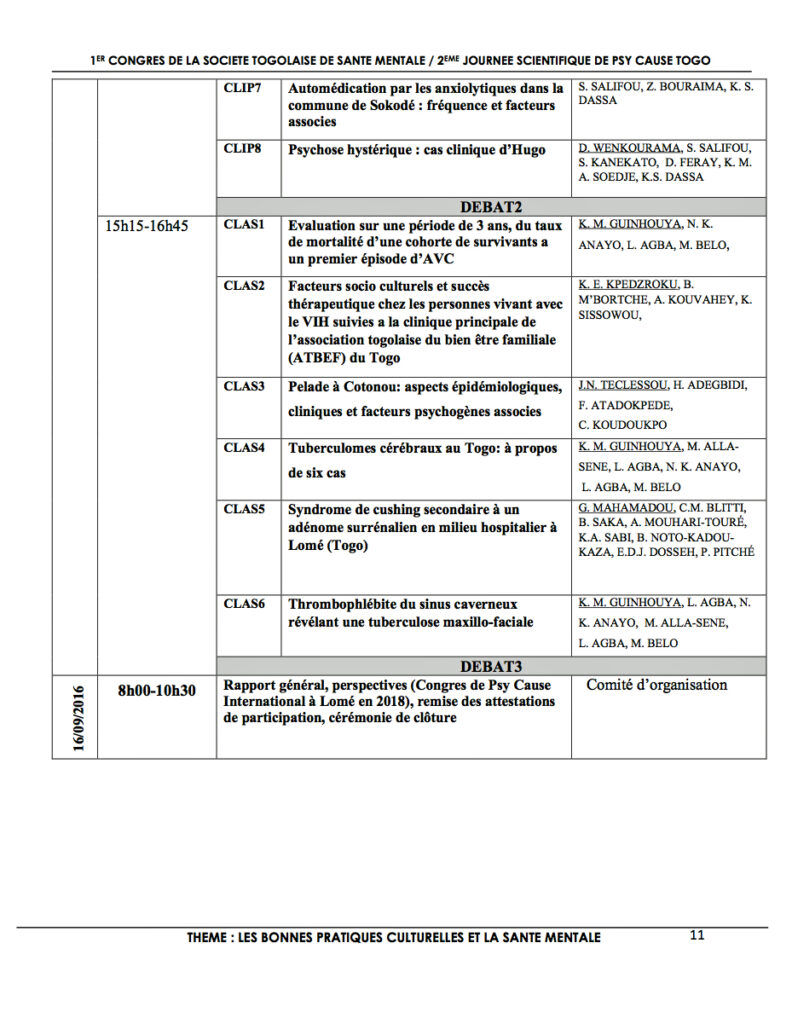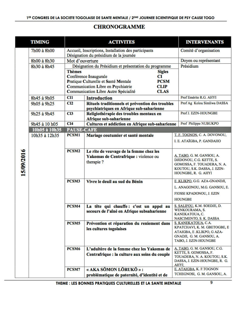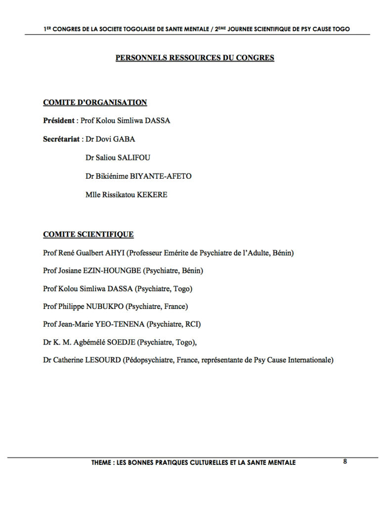 Le Président de Psy Cause International écrit : « Les 15 et 16 septembre 2016 à Lomé, sur le thème « Les bonnes pratiques culturelles et la santé mentale », se déroule le second colloque annuel de Psy Cause Togo en partenariat avec la Société Togolaise de Santé Mentale. L’exécutif y sera représenté par la Dr Catherine Lesourd, membre de la cellule d’appui pour les congrès internationaux. Elle y initiera une phase préparatoire à notre congrès international de Lomé prévu en 2018 et soumis actuellement à une consultation des membres du Conseil d’Administration.