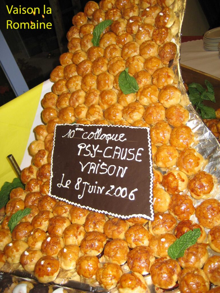En cette année 2006, les derniers ténors de la psychothérapie institutionnelle encore en activité donnent de la voix. Le lieu qui a été le terreau de la fondation de Psy Cause, à savoir l’hôpital psychiatrique héritier de la loi de 1838 et de la révolution humaniste institutionnelle des lendemains de la seconde guerre mondiale, vivait ses ultimes moments féconds. Trois mois plus tard, en juin 2006, Psy Cause tenait à Vaison la Romaine son dixième colloque national sur le thème de la psychothérapie institutionnelle. Près de deux cent participants et un plateau de personnalités engagées dans ce courant (dont les Drs Karavokyros, Bokobza et les principaux chefs de service concernés du Centre Hospitalier de Montfavet) ont fait de cette manifestation scientifique l’un de nos derniers grands rassemblements en Hôpital Public. (Il n’a pas donné lieu à un stand mais tout de même à une remarquable pièce montée archivée et publiée ci contre).