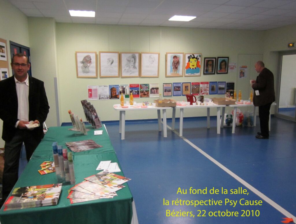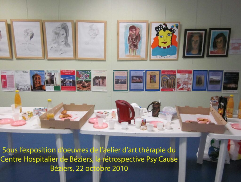 Le public est au rendez vous malgré des conditions de déplacement très défavorables : grève des chemins de fer et blocage des stations service. La crise économique mondiale impacte le contexte social. L’art thérapie, et plus largement la médiation artistique, sont un nouvel espace d’échanges qui prend quelque peu le relai de la psychothérapie institutionnelle. D’ailleurs, après sa mise en veilleuse fin 2012 au niveau de Psy Cause France, ce courant fera retour en 2015 avec l’arrivée d’une nouvelle référente de la psychothérapie institutionnelle, en la personne d’une éducatrice spécialisée qui exerce dans un IME de Montpellier où l’art thérapie côtoie la psychothérapie institutionnelle.