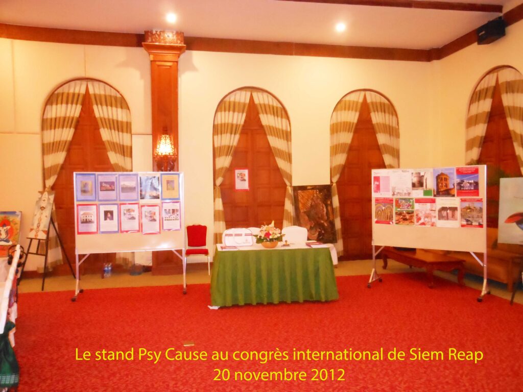 Notre quatrième stand archivé est au Cambodge, le 20 novembre 2012 à Siem Reap (Angkor), dans le cadre d’un congrès dont le thème est le bouddhisme en psychiatrie et dans les psychothérapies. Notre association/revue a, deux mois plus tôt, modifié ses statuts pour y intégrer sa dimension internationale francophone. Elle prend pied en Extrême Orient. La prise en compte d’une clinique d’inspiration bouddhiste allait par la suite connaître des développements : au Canada avec la thérapie de pleine conscience et au Japon avec la thérapie de Morita. Un autre développement sera la reconnaissance de l’œuvre de reconstruction de la psychiatrie cambodgienne après le génocide des Khmers Rouges, par le président de notre congrès, le Pr Ka Sunbaunat, lui même un rescapé de ce terrible massacre. Ce dernier recevra en 2014 lors du congrès mondial de psychiatrie de Madrid, en présence du Pr Raymond Tempier (Ottawa) représentant de Psy Cause auprès de la WPA, qui l’avait recommandé, le prix de Genève des droits de l’homme en psychiatrie.
