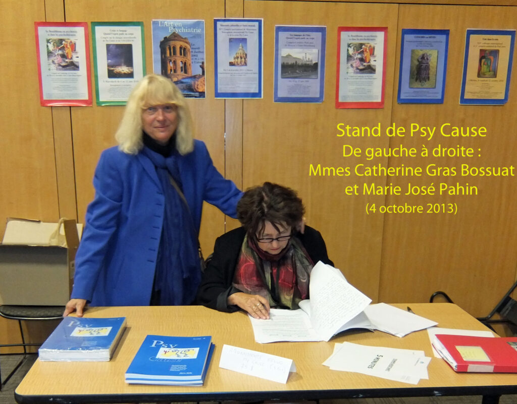 Notre sixième occurrence d’un stand archivé est au Canada : le 4 octobre 2013 à l’Hôpital Montfort, Ottawa. Notre VIIIème congrès international, managé localement par le Pr Raymond Tempier, sur le thème des minorités culturelles, se déroule dans un établissement francophone emblématique de la communauté franco ontarienne. Cette dernière s’était mobilisée, avec de nombreux ontariens anglophones, dans les rues d’Ottawa pour en empêcher, avec succès, la fermeture décidée par la Province. Un « monument de la francophonie » raconte, à l’entrée de l’hôpital, la « bataille de Montfort ». Des professionnels québécois et même des amérindiens Mohawks ont fait le déplacement à notre congrès. C’est à l’occasion de cette manifestation scientifique que fut prise la décision de créer une section Psy Cause Canada, laquelle sera fondée à l’Institut Universitaire en Santé Mentale de Montréal, le 19 septembre 2015.