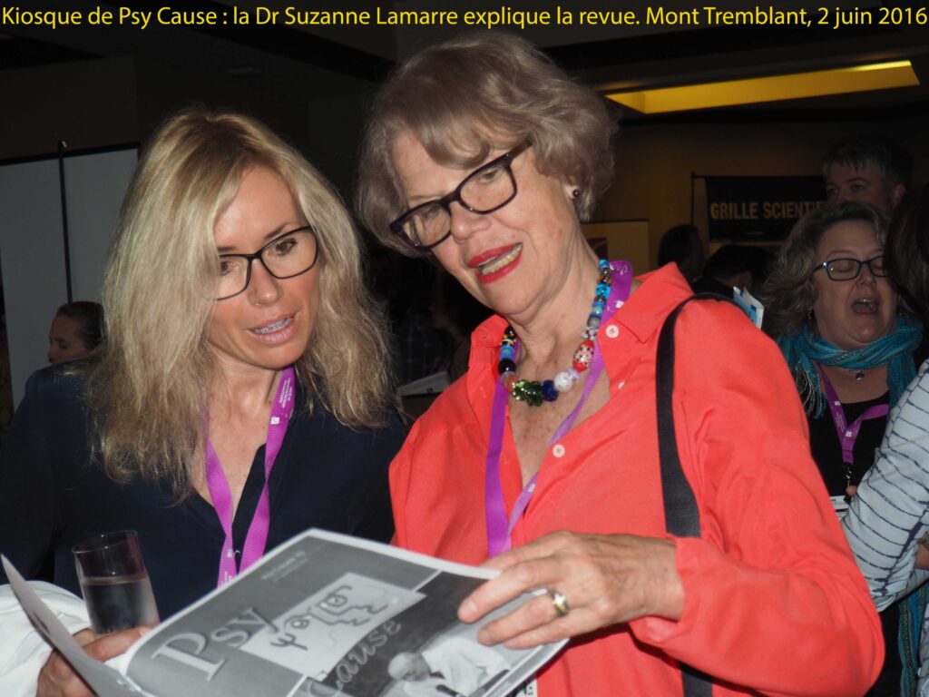 Le stand propose aux participants québécois intéressés par le bloc, de déposer leur adresse courriel pour recevoir nos informations et plus particulièrement un abonnement gratuit d’une année à la version PDF numérique de la revue Psy Cause. Une centaine de psychiatres font au stand cette demande, tout au long des trois journées de congrès. Le Dr Pierre Assalian, Président du comité de développement professionnel dans l’AMPQ et parrain du partenariat AMPQ/Psy Cause, a encouragé les congressistes à visiter le stand. Ainsi, en ce mois d’octobre 2016, une centaine de psychiatres québécois a eu la possibilité de lire notre N°71 dont les trois quarts ont été consacrés au Canada : en première partie un cahier franco ontarien et en seconde partie le « bloc » Psy Cause Canada à Mont Tremblant. Il existe en effet au niveau de l’organisation de la section Psy Cause Canada, des actions plus spécifiquement québécoises pilotées à Montréal et des actions plus spécifiquement ontariennes pilotées à Ottawa par le coordonnateur délégué pour l’Ontario, le Pr Raymond Tempier.