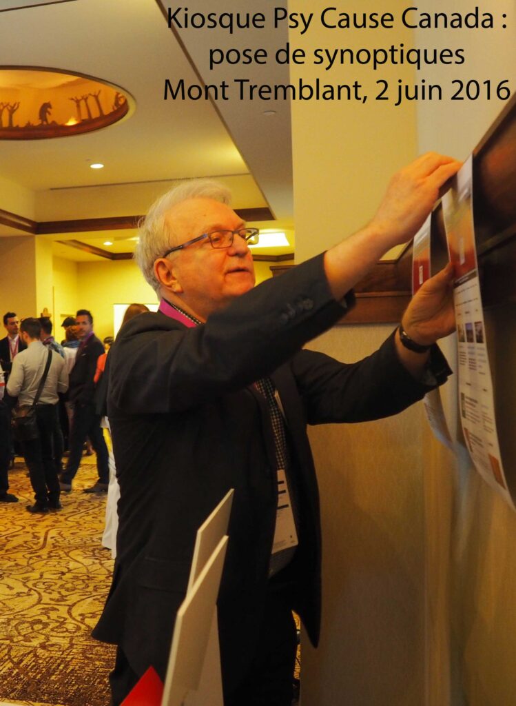 Notre neuvième occurrence d’un stand Psy Cause archivé est au Québec : le 2 juin 2016 à Mont Tremblant. Il s’agit du stand de Psy Cause Canada au congrès des 50 ans de l’AMPQ (Association des Médecins Psychiatres du Québec). La section canadienne de Psy Cause International a établi un partenariat avec l’AMPQ dès sa fondation. Le 3 juin 2016, elle bénéficie d’un temps et d’une salle dans ce congrès pour un « bloc » Psy Cause. Ce kiosque est réalisé par une branche nationale de notre association, en toute autonomie puisque Psy Cause International est représenté par un administrateur de Montréal, le Pr François Borgeat (qui fut le président du comité scientifique du congrès d’Ottawa), dans un contexte AMPQ/Psy Cause Canada. Le kiosque s’adresse aux 600 psychiatres congressistes de l’AMPQ et tout particulièrement aux 400 inscrits au « bloc » du 3 juin. Ce kiosque est animé avec enthousiasme par les deux coordonateurs montréalais de notre section : les Drs Suzanne Lamarre et Marcel Hudon.