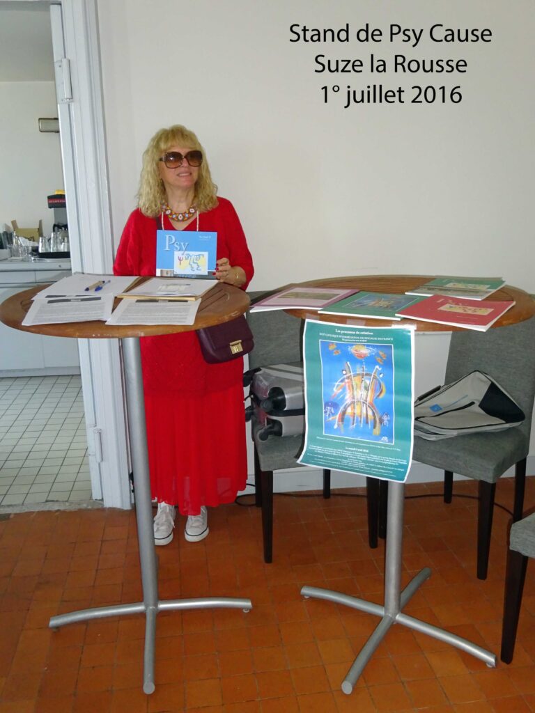 Notre dixième et plus récente occurrence d’un stand Psy Cause archivé est dans le sud de la France : les 1 et 2 juillet 2016 au château de Suze la Rousse. Nous avions été invités par le secrétaire général de l’association organisatrice du colloque « Qu’est ce que penser ? », le Dr Jean Louis Griguer, à présenter une information sur Psy Cause aux congressistes sous la forme d’un petit stand. À ces Sixièmes Rencontres de Suze la Rousse de l’Association Française de Psychiatrie, nous venons quelque part en voisins. Ce château est en effet situé à une dizaine de kilomètres de celui de Rochegude, lieu du rassemblement annuel de Psy Cause France en 2014, 2015 et 2016, managé pour Psy Cause par le Dr Jean Louis Griguer. Nous n’avons installé qu’une seule affiche, celle du colloque Rochegude III d’avril 2016. Notre déplacement à Suze la Rousse correspond à une visite de courtoisie.