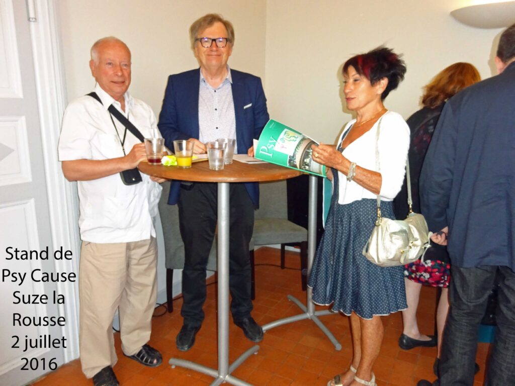 Les membres de l’AFP sont majoritairement des psychiatres libéraux, mais aussi des psychiatres d’exercice public, et des universitaires qui ont contribué brillamment au haut niveau scientifique de ce colloque. Avec ce stand Psy Cause à Suze la Rousse, nous sommes, dix années plus tard, dans la même démarche qu’à Laragne : aller à la rencontre de professionnels qui pourraient se reconnaître dans notre action. Le document de présentation de l’Association Française de Psychiatrie remis à chaque congressiste à Suze la Rousse évoque « un lieu de confrontation et d’échanges d’idées et d’expériences, en rassemblant des acteurs de la psychiatrie ayant des positions théoriques et des modes d’exercice très variés, et en leur permettant de débattre à propos de leurs conceptions et de leurs pratiques. » Ce qui est proche de nos propres fondamentaux.