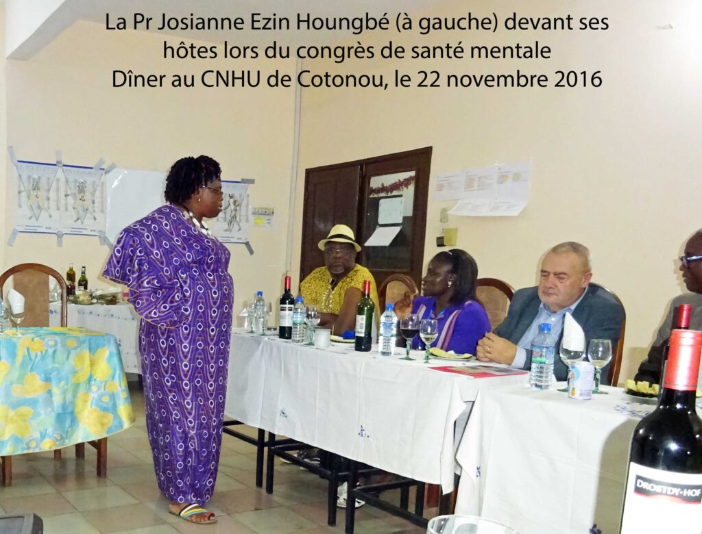 La Pre Josiane Ezin Houngbé reçoit à dîner, au soir de la première journée de congrès, dans une salle du CNHU de Cotonou, le directeur de la revue Psy Cause et sa femme ainsi qu’un certain nombre de conférenciers et intervenants. Au cours des échanges lors de ce moment convivial, Le Pr Tognon ainsi que d’autres congressistes venus de Parakou, ville du centre Bénin où s’était déroulé le premier congrès de Psy Cause en Afrique Subsaharienne en 2008, ont exprimé leur souhait de la création rapide au Bénin d’une antenne Psy Cause Bénin. En effet, alors que la Côte d’Ivoire et le Cameroun en 2012, puis le Togo en 2015 et le Sénégal en 2016, ont mis en place une structure Psy Cause, il conviendrait, selon nos interlocuteurs, qu’au Bénin où Psy Cause a une histoire très ancienne, il en soit de même.