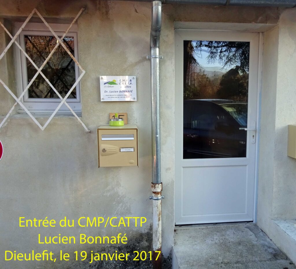 Le directeur de Psy Cause a donc fait le voyage depuis Avignon, d’autant plus volontiers qu’en se référant à la mémoire du Dr Lucien Bonnafé, le CMP/CATTP de Dieulefit rend hommage au courant de la psychiatrie désaliéniste et de la psychothérapie institutionnelle qui a transformé la prise en charge des malades mentaux dans le service public français au lendemain de la seconde guerre mondiale, et qui fut une référence majeure de Psy Cause lors de sa fondation. Nous découvrons, sur les hauteurs en face du village, au milieu de la neige, au 1F Allée des Rossignols, l’entrée de ce lieu de soins, arborant une plaque portant le nom de Lucien Bonnafé.