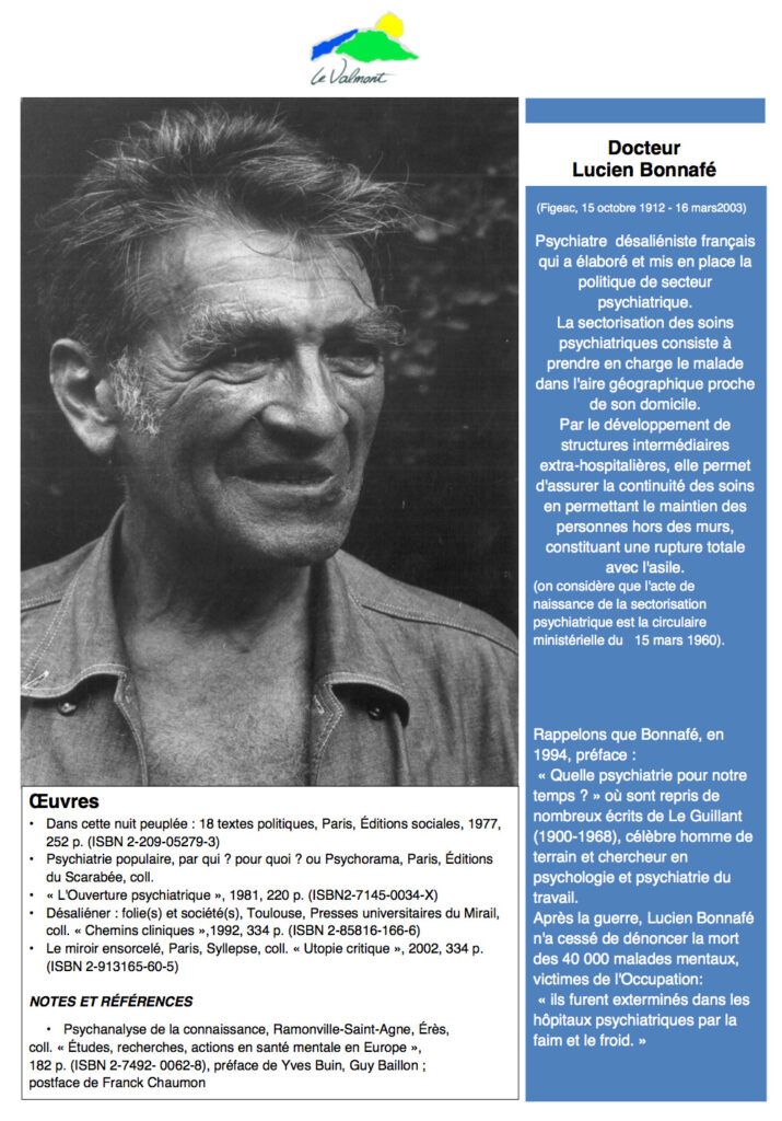 Une affiche (à voir en cliquant sur l’image ci contre) est disposée en divers lieu du CMP/CATTP aménagé sur deux niveaux. Elle présente ainsi le Dr Lucien Bonnafé : « Docteur Lucien Bonnafé (Figeac, 15 octobre 2012 – 16 mars 2003), psychiatre désaliéniste français qui a élaboré et mis en place la politique de secteur psychiatrique. La sectorisation des soins psychiatriques consiste à prendre en charge le malade dans l’aire géographique proche de son domicile. Par le développement de structures intermédiaires extra-hospitalières, elle permet d’assurer la continuité des soins en permettant le maintien des personnes hors les murs, constituant une rupture totale avec l’asile. (On considère que l’acte de naissance de la sectorisation psychiatrique est la circulaire ministérielle du 15 mars 1960). » Est également évoquée sur ce document, la dénonciation par le Dr Lucien Bonnafé, après la guerre, de la mort de faim et de froid de 40 000 malades mentaux dans les hôpitaux psychiatriques sous l’Occupation.