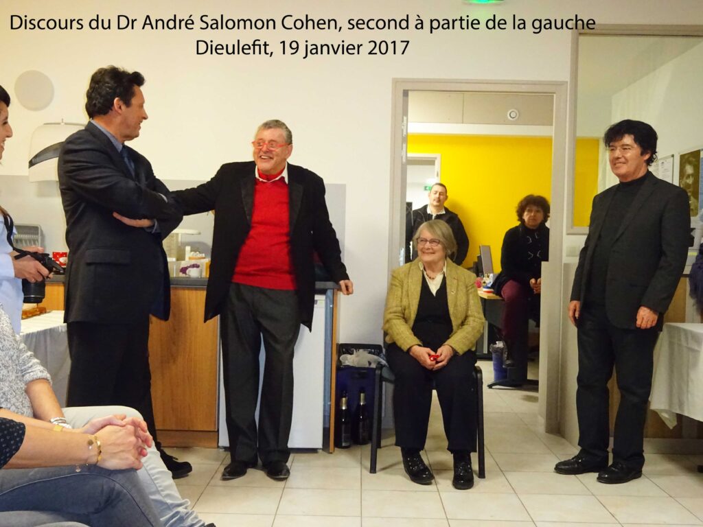 Le Dr André Salomon Cohen, psychiatre du service et intervenant au CMP/CATTP Lucien Bonnafé, nous présente la Dr Marie Bonnafé. Il utilise la métaphore cinématographique du film « La vie est belle » pour nous dire que ce n’est pas parce que ça va mal que nous ne pouvons pas espérer. Il voit Marie Bonnafé dans le rôle de l’ange d’un conte de Noël, à cette fin. Il nous parle ensuite de liberté : celle de Lucien Bonnafé aux côtés de Paul Eluard à Saint Alban pendant la guerre, pour résister contre l’envahisseur nazi et éviter que les malades de l’hôpital psychiatrique ne meurent de faim. Il évoque Paul Eluard réfugié à Dieulefit en 1941. Il cite quelques propos de Lucien Bonnafé : « l’esprit de résistance qui va de soi » qui consiste à venir au secours d’un être humain en difficulté même si on risque la peine de mort pour cela. Egalement une définition : « Le désaliéniste est celui qui se présente sur la place publique pour dire : que puis-je pour vous ? ». Le désaliénisme, nous dit le Dr André Salomon Cohen, « c’est : les soins au plus près de la population. »
