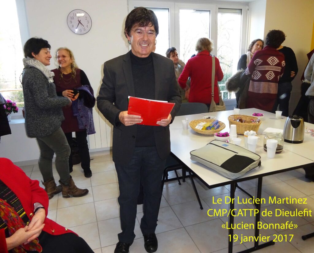Le directeur du Centre Hospitalier Le Valmont (Valence), Mr Claude Eldin, prend à son tour la parole. Il est heureux, nous dit il, d’inaugurer le CMP/CATTP : « il est rare aujourd’hui de créer une structure nouvelle. » Il souligne la pertinence d’avoir choisi le nom de Lucien Bonnafé pour cette unité de soins car ce dernier fut « l’un des pères fondateurs du secteur avec la circulaire de 1960 ». Il rappelle que la rédaction de cette circulaire avait été le fruit d’une coopération exemplaire entre l’administration et les médecins. Attirant ainsi l’attention du public sur l’intérêt d’une telle coopération dans le contexte de la gouvernance actuelle au sein du système hospitalier public en France.