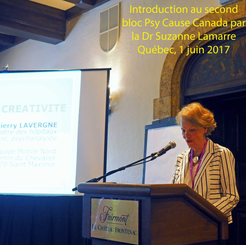 Le compte rendu qui va suivre a été rédigé par la Dr Suzanne Lamarre, co-coodonatrice avec le Dr Marcel Hudon de la section Psy Cause Canada fondée à l’Institut Universitaire en Santé Mentale de Montréal le 19 septembre 2015. La Dr Suzanne Lamarre a managé tout particulièrement le symposium, le Dr Marcel Hudon étant retenu au même moment par des obligations au congrès de la Société Canadienne de Psychanalyse. Le thème du 51ème congrès de l’AMPQ « De la recherche à la clinique : dialogue entre la science et l’art », a fortement inspiré la Dr Suzanne Lamarre qui est administratrice des « Impatients », espace thérapeutique centré sur l’art, tout comme l’est le Pr Emmanuel Stip.