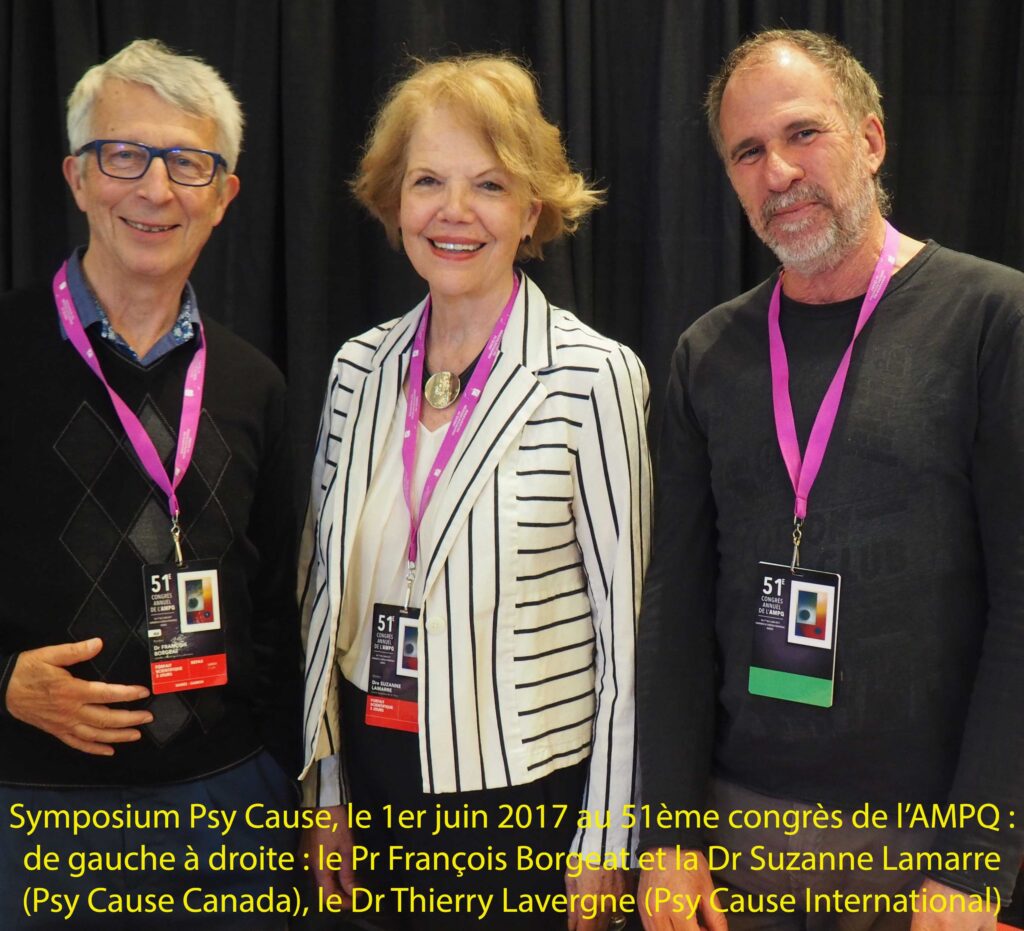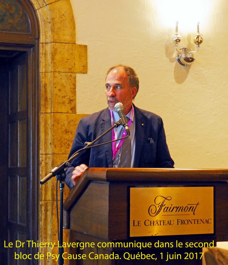 Rappelons que le projet de créer une section Psy Cause Canada se fit au décours de notre congrès d’Ottawa en octobre 2013 à l’Hôpital francophone Monfort, managé sur place par le Pr Raymond Tempier dont l’engagement dans la revue Psy Cause remonte à presque vingt ans, et à Montréal par les Prs François Borgeat et Emmanuel Stip. Notre revue/association a connu, depuis 2013, une expansion quasi exponentielle de son implantation internationale francophone. Pour mieux répondre à ses engagements, le bureau de Psy Cause International a été dans l’obligation de structurer ses modalités d’intervention. Le Dr Thierry Lavergne s’est tout naturellement proposé pour travailler avec le Québec et les dirigeants à Montréal de Psy Cause Canada avec lesquels il avait établi des liens privilégiés : le Pr François Borgeat, représentant de la section au Conseil d’Administration, les Drs Marcel Hudon et Suzanne Lamarre élus co-coordonateurs lors de l’AG fondatrice de 2015. C’est donc à plusieurs titres que le Dr Thierry Lavergne est invité comme conférencier du second symposium de Psy Cause Canada, ce 1er juin 2017.