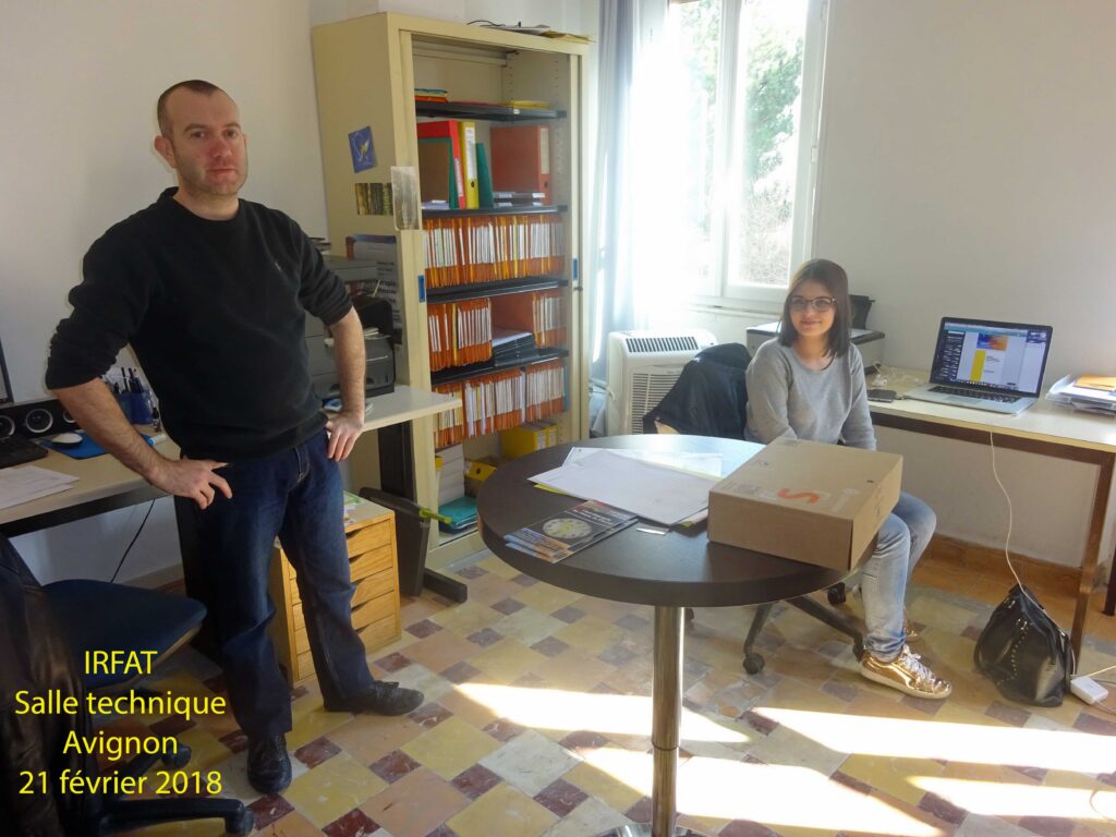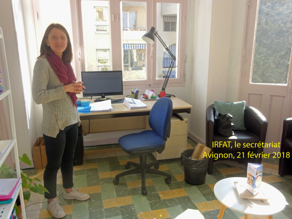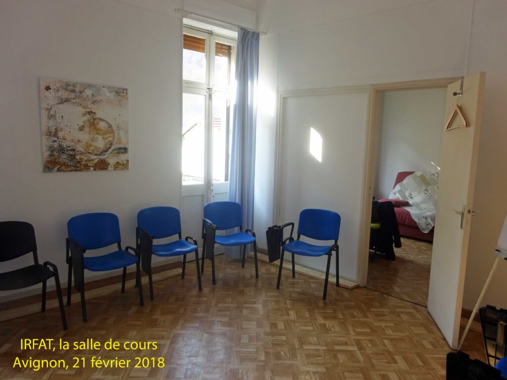 Ce 21 février 2018, le directeur de l’IRFAT, Mr Alain Gleize, fait visiter ses locaux, en commençant par une salle de cours décorée par une œuvre réalisée en atelier de formation. Précisant l’existence d’une rotation des œuvres. Deux chambres sont aménagées pour l’hébergement de formateurs. Des locaux techniques, dont le secrétariat, sont l’occasion de rencontrer quelques membres de l’équipe de l’école. Mr Alain Gleize informe que ces locaux sis au 24 de la rue Guillaume Puy ne résument pas les espaces utilisés lors des sessions de formation. Diverses salles sont en effet louées en fonction des besoins lors de ces sessions.