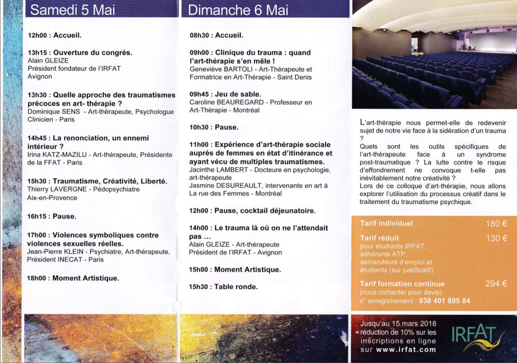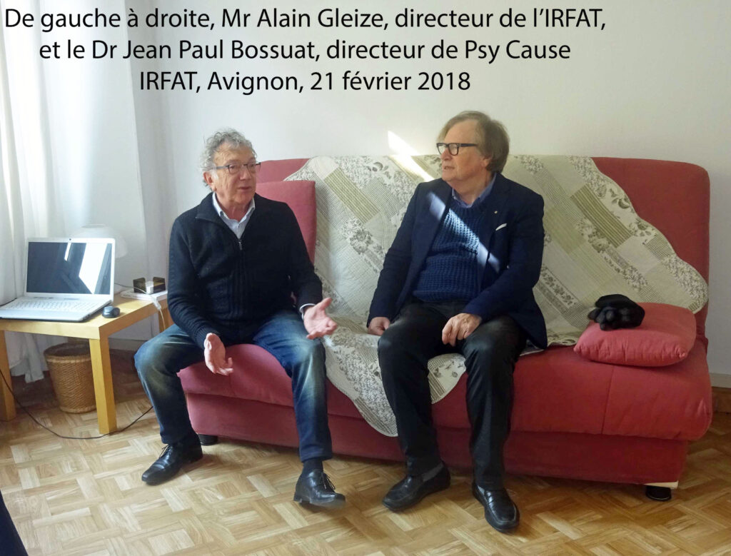 Hasard du calendrier, la venue du directeur de Psy Cause en février 2018 coïncide avec le vingtième anniversaire de l’IRFAT… Le site de l’IRFAT rappelle en effet : « Le centre de formation IRFAT a été créé en février 1998 par Alain GLEIZE, art-thérapeute accrédité par la Fédération Française des Art-Thérapeutes. »