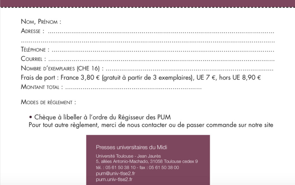 Prix du livre : 25 €. Ci contre un bon de commande à adresser aux Presses Universitaires du Midi.