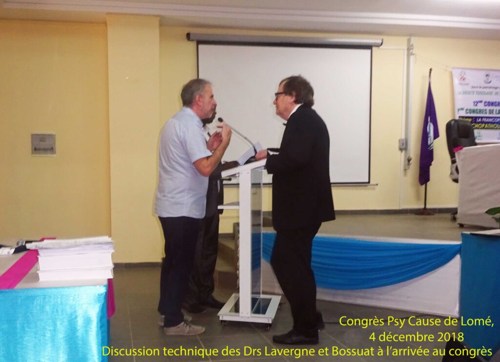 Un temps de concertation technique est consacré dans la salle au déroulement à venir de la cérémonie d’accueil. Le Dr Thierry Lavergne, vice président de Psy Cause International, ainsi que le Dr Jean Paul Bossuat, président de Psy Cause International, (photo ci contre), échangent avec le maître de cérémonie. Ils mettent en particulier au point la remise à l’université de Lomé par Mr le ministre de l’Enseignement Supérieur et de la Recherche, des deux volumineux tomes du manuel québécois de psychiatrie du Pr Lalonde et coll « Psychiatrie clinique, approche bio-psycho-sociale. » Ainsi que l’annonce de la remise à Psy Cause Togo d’exemplaires du N°76 de la revue Psy Cause consacré en quasi totalité au « Cahier Togolais ». La publication de ce dossier Spécial Togo, dont la composition a été managée par le Dr Saliou Salifou, a été programmée pour être à disposition lors du congrès. Dix articles y mettent en valeur la santé mentale togolaise.