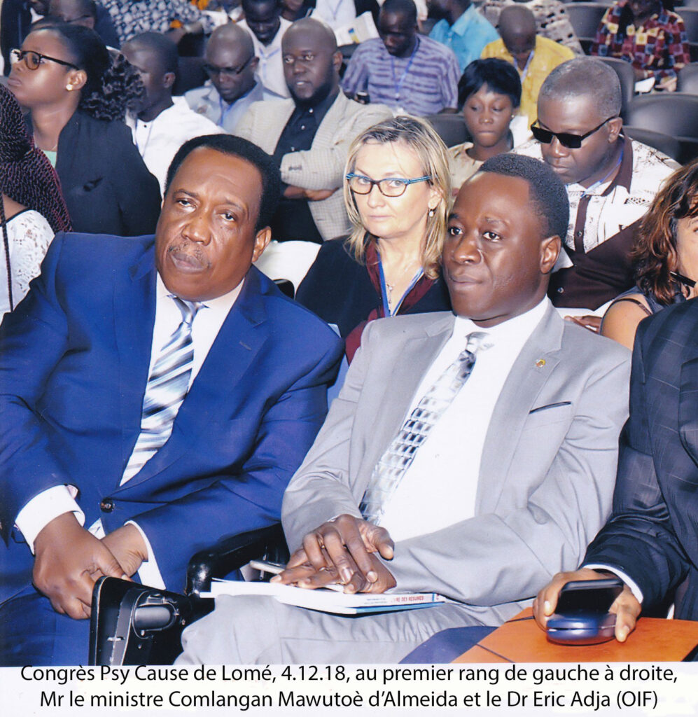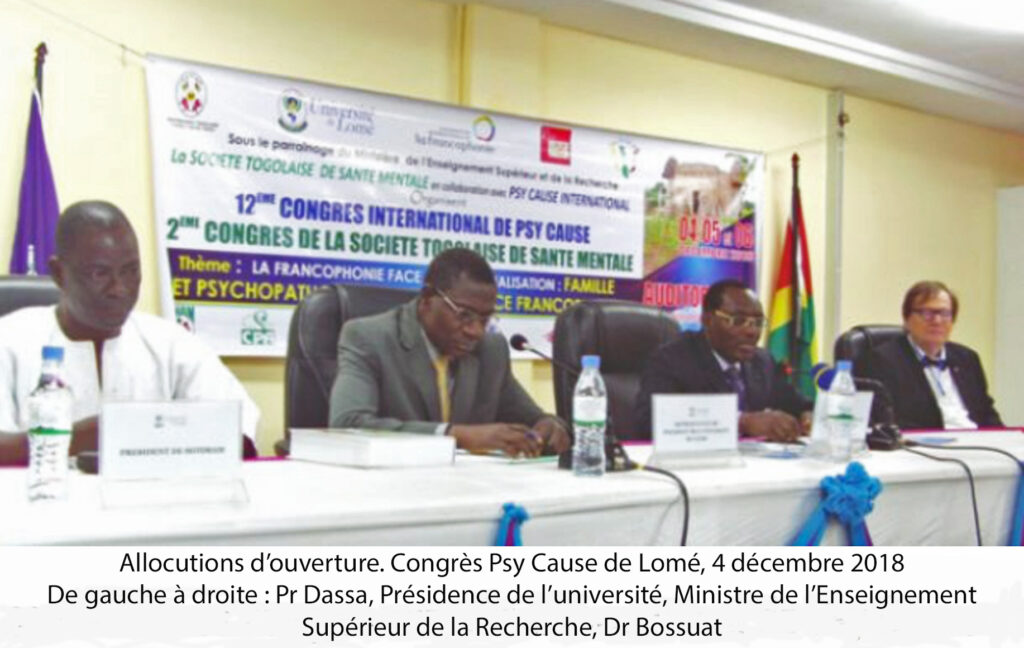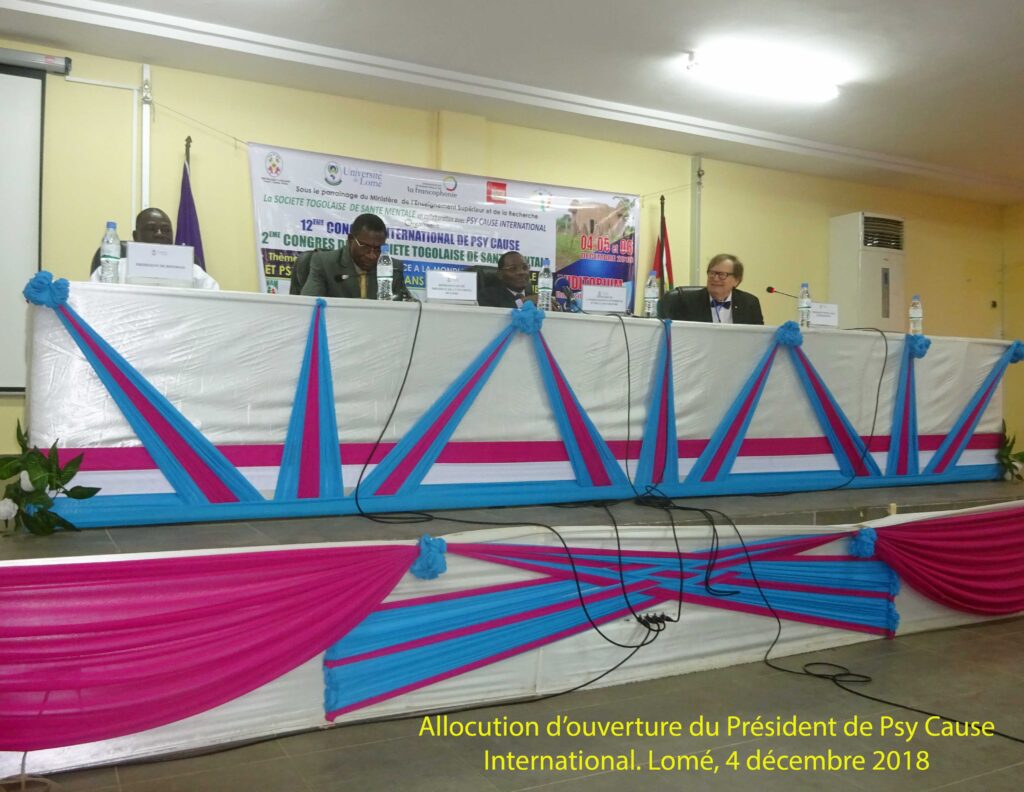 Il rappelle, dans ce mot introductif, que la rencontre de ces premiers jours de décembre 2018 à Lomé, qui rassemble des acteurs de la santé mentale partageant l’usage de la langue française, « n’a été possible que grâce aux efforts de Psy Cause Togo, une société savante fondée à Lomé le 3 avril 2015, reliée à Psy Cause International par une convention. » Il rappelle également que cette jeune association s’est lancée sans tarder dans l’organisation de deux colloques nationaux : le 10 juillet 2015 sous le thème « Culture et Santé Mentale au Togo », les 15 et 16 septembre 2016 sous le thème « Les bonnes pratiques culturelles et la santé mentale. » (Ce second colloque étant combiné au premier congrès de la Société Togolaise de Santé Mentale). Il conclut : « ces deux essais ont donné une certaine maturité à Psy Cause Togo pour accueillir ce présent congrès, je veux dire le douzième Congrès International de Psy Cause qui s’annonce très riche ».