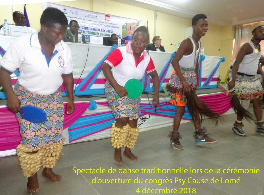 La cérémonie d’ouverture se poursuit avec un intermède artistique : un groupe togolais de danse traditionnelle se produit devant la tribune, face au public. Cette exhibition culturelle est un incontournable de tout congrès de santé mentale en Afrique Subsaharienne. Les organisateurs togolais n’ont pas failli au respect de cette tradition. Le spectacle est apprécié du public tant africain qu’européen (français, belge, allemand) et canadien. Les liens déjà évoqués entre la danse et l’esprit trouvent là, dans le contexte d’un congrès scientifique, leur pertinence.