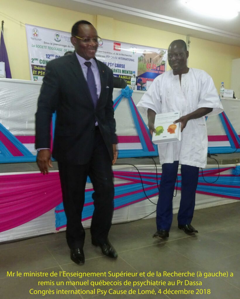 Comme annoncé par le Président de Psy Cause International après la conclusion de son allocution d’ouverture, le Pr Octave Nicoué Broohm, ministre de l’Enseignement Supérieur et de la Recherche, remet solennellement le manuel québécois de psychiatrie du Pr Lalonde et coll « Psychiatrie clinique, approche bio-psycho-sociale » au Pr Kolou Simliwa Dassa, afin qu’il soit mis à la disposition des étudiants togolais en psychiatrie et dans le champ de la santé mentale. Ceci par l’intermédiaire de Psy Cause et tout particulièrement du Dr Thierry Lavergne, au titre de Psy Cause International, et du Pr François Borgeat, au titre de Psy Cause Canada. Et dans le cadre d’un événement organisé à Lomé par Psy Cause Togo.